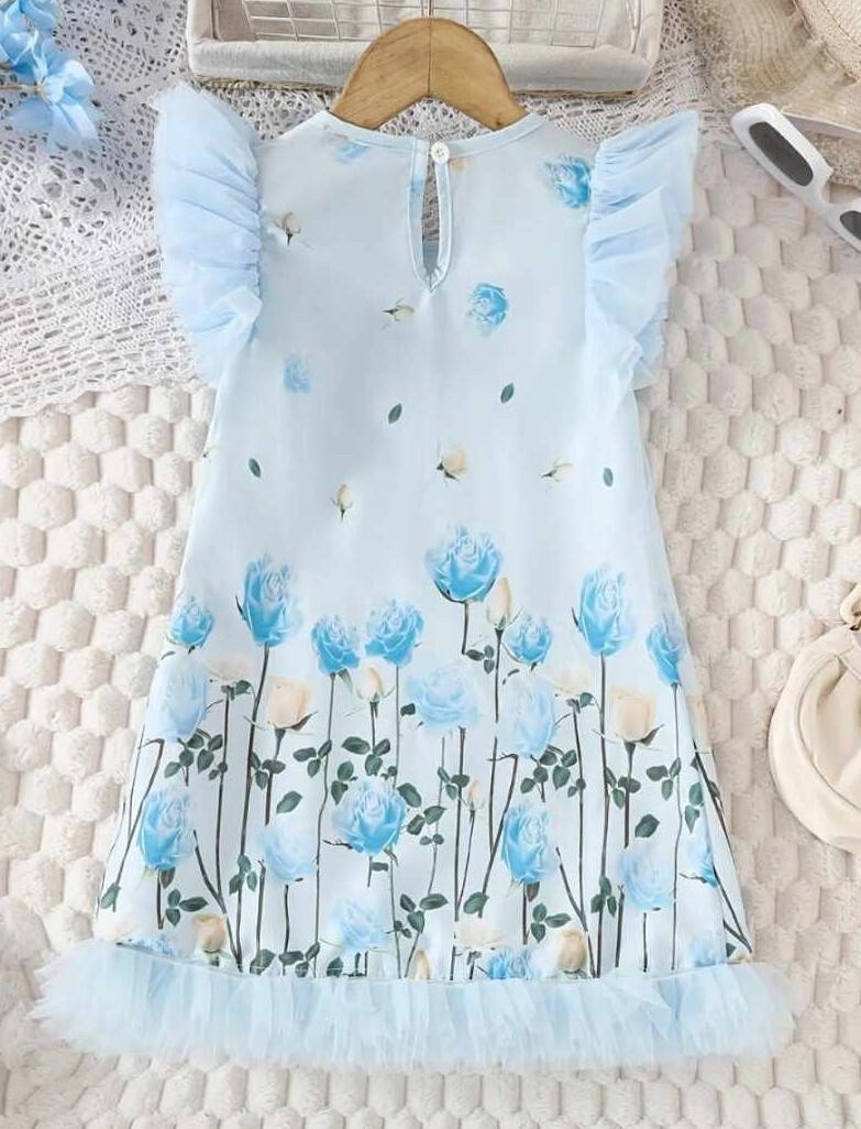 NWOT GIRLS LT. BLUE FLORAL PRINT DRESS W/RUFFLE TULLE SLEEVES HEM - SZ. 5