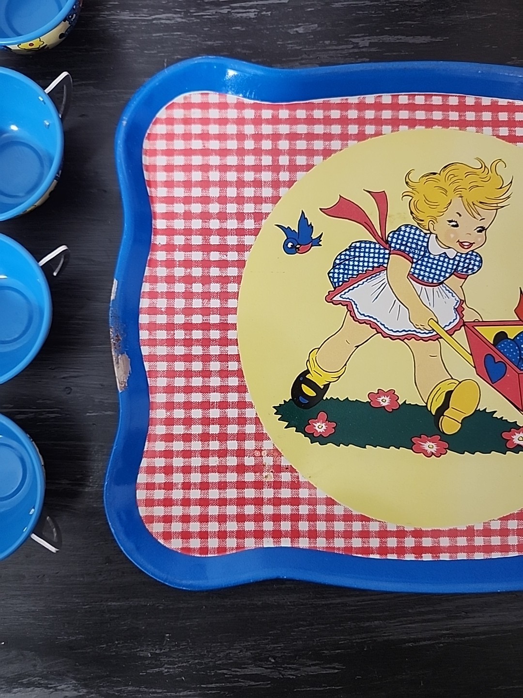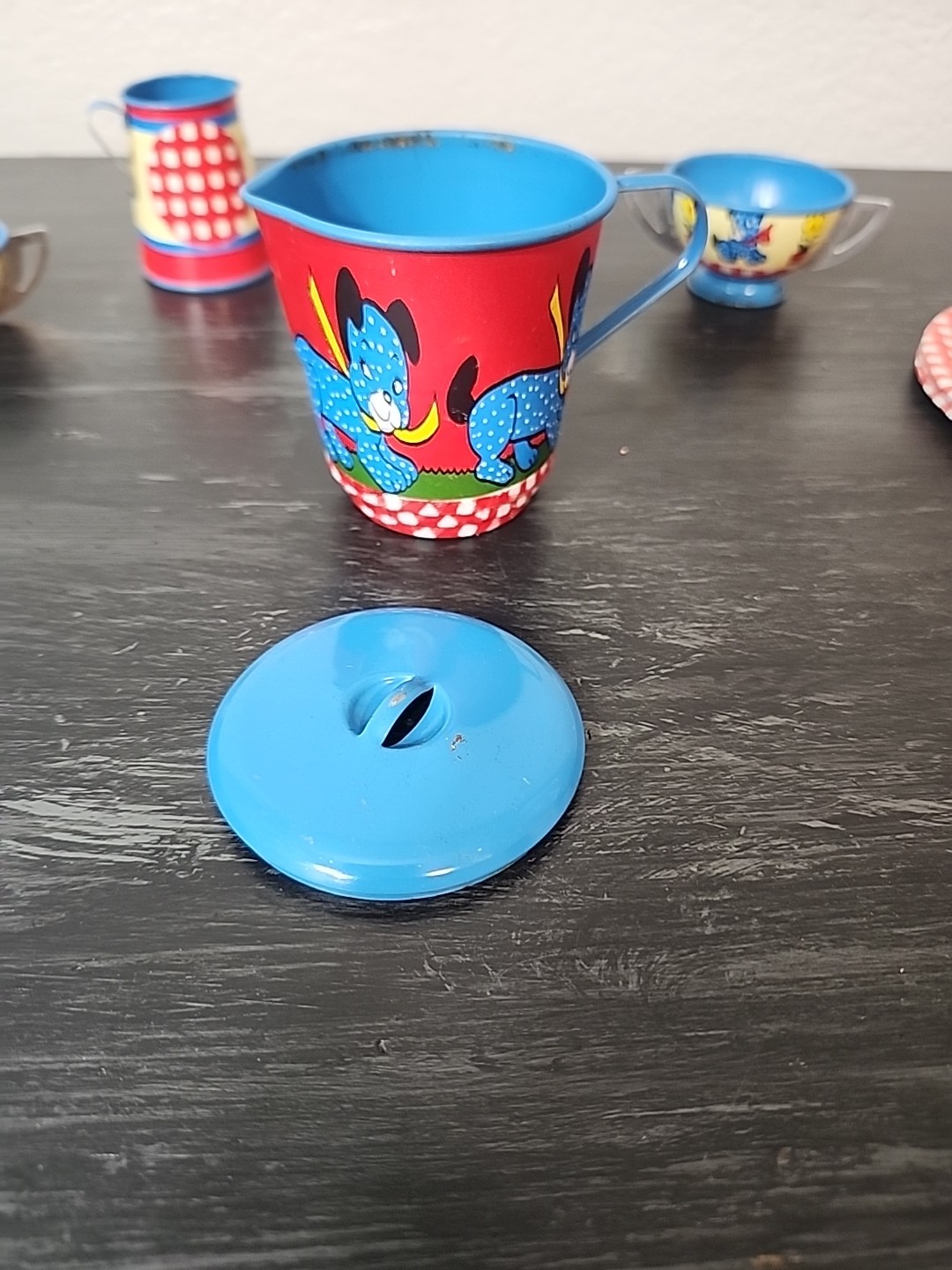 Vintage OHIO ART 1950s 20 Piece Set Tin Litho Child's Tea Set Girl w/ Puppy Dog