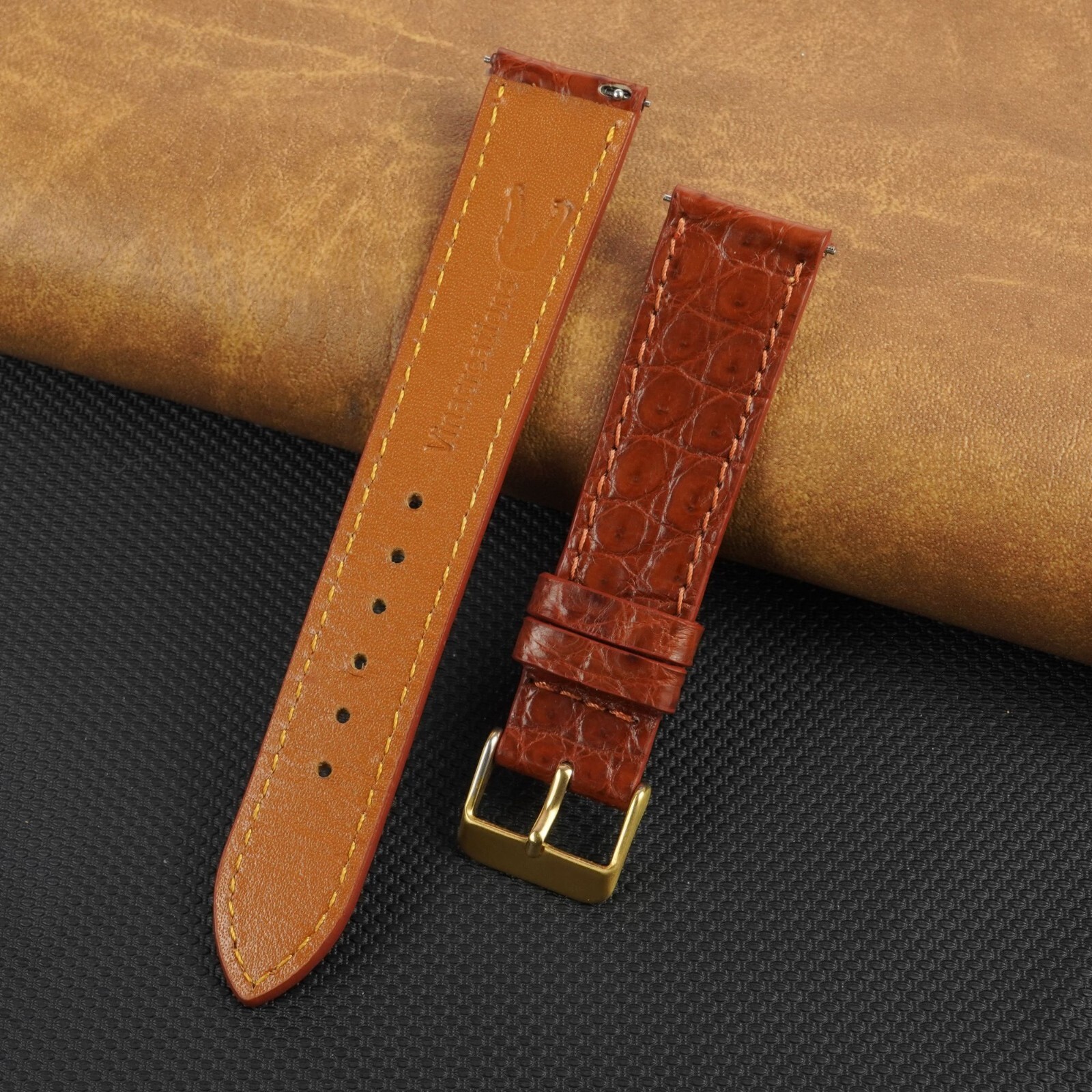как выглядит 20mm Brown Flat Leather Watch Band Genuine Crocodile Watch Strap Gold Buckle фото