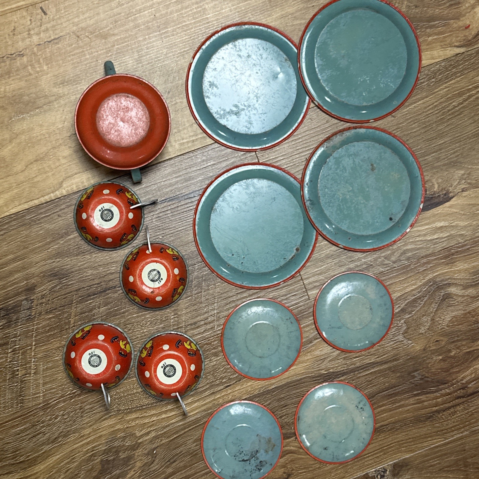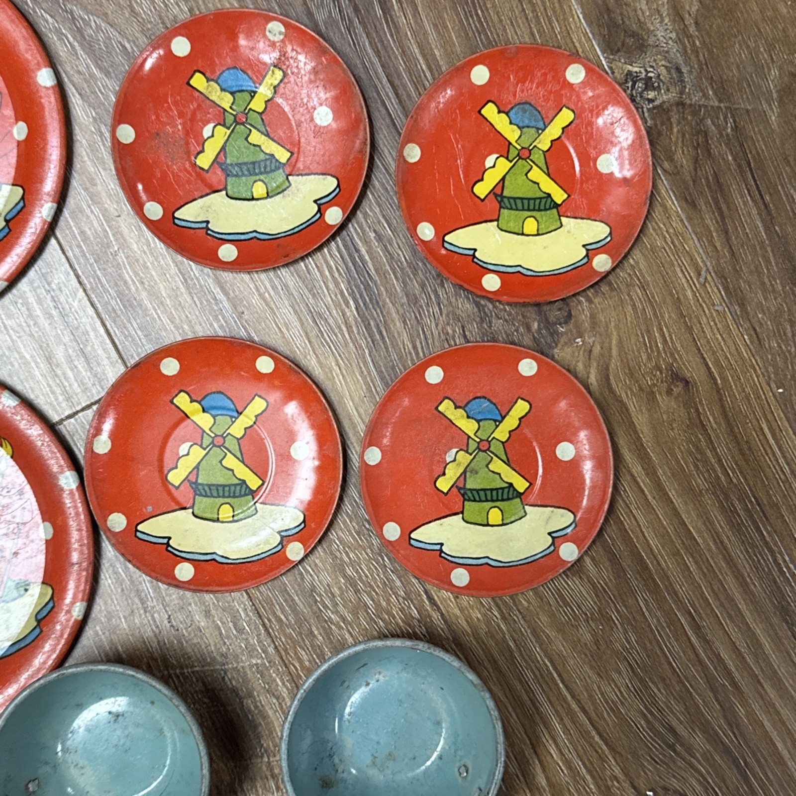 как выглядит Vintage Tin Childs Tea Set, Ohio Art 150, Dutch Winter, 13 Pieces, 2 Kettles фото
