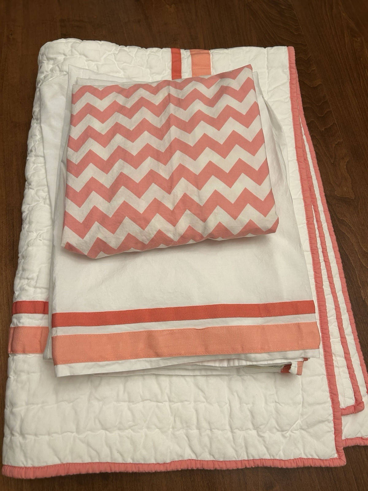 Pottery Barn Kids Crib Quilt, Dust Ruffle, Sheet White w/ Coral/Pink Trim 34x 48