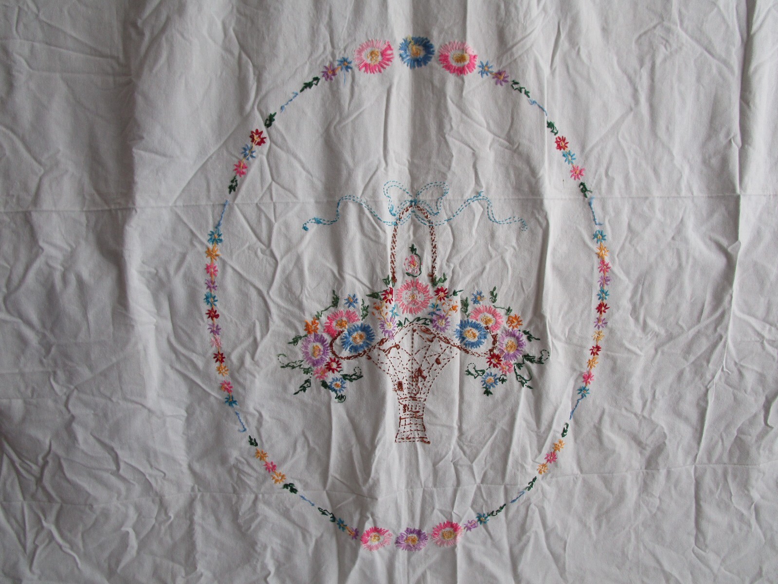 • Vintage 1950s Flower Basket COVERLET QUILT, EMBROIDERED Summer Weight, 74 X 84