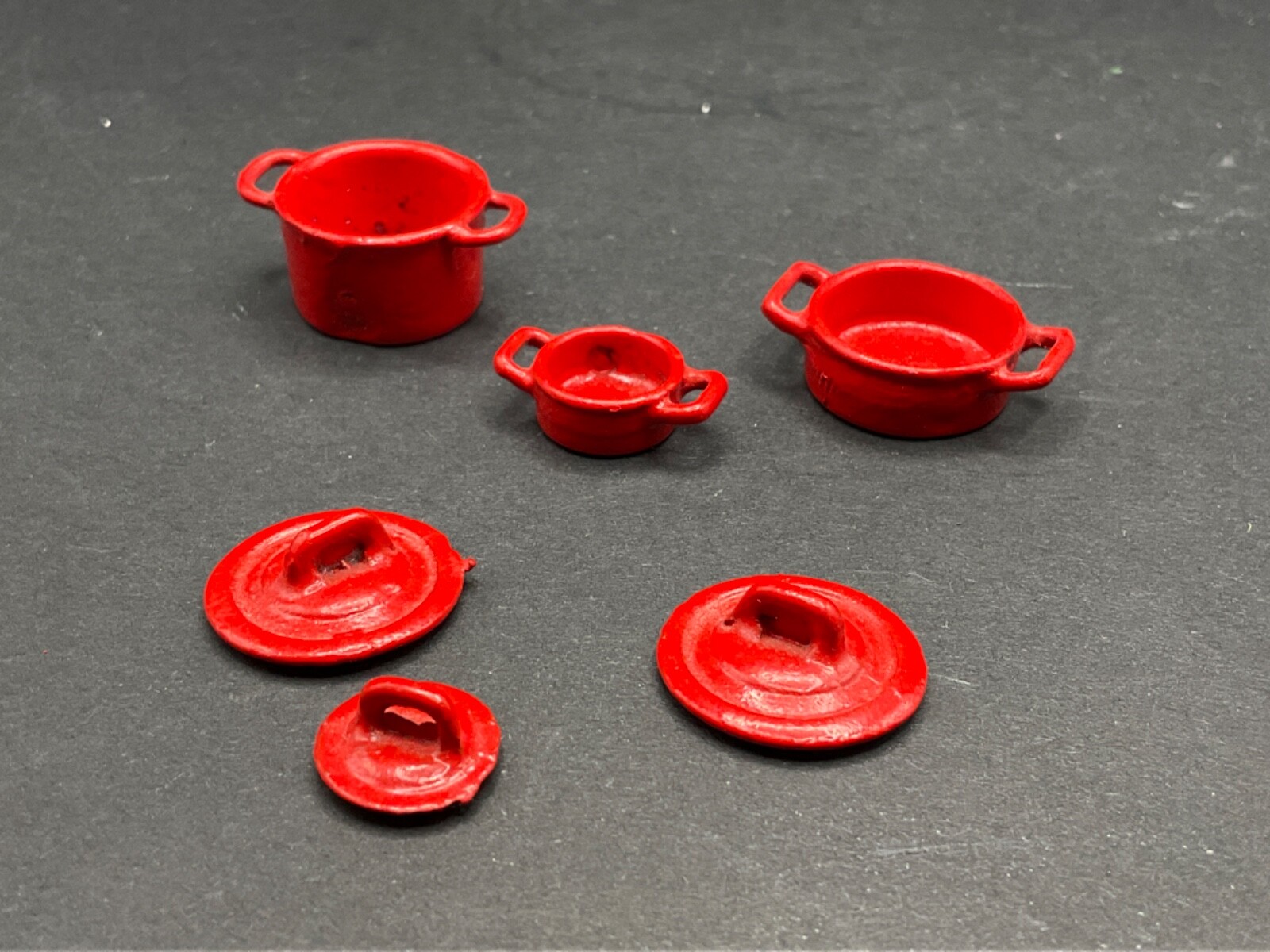 • 3PC Dollhouse Kitchen Set Cookware Red Metal Pot Miniature Enamelware
