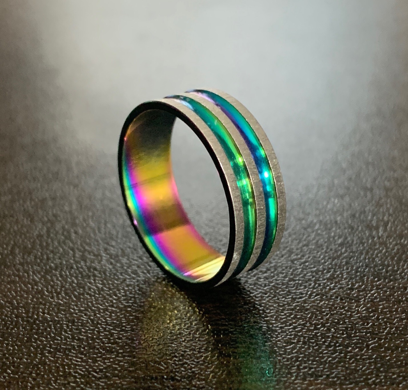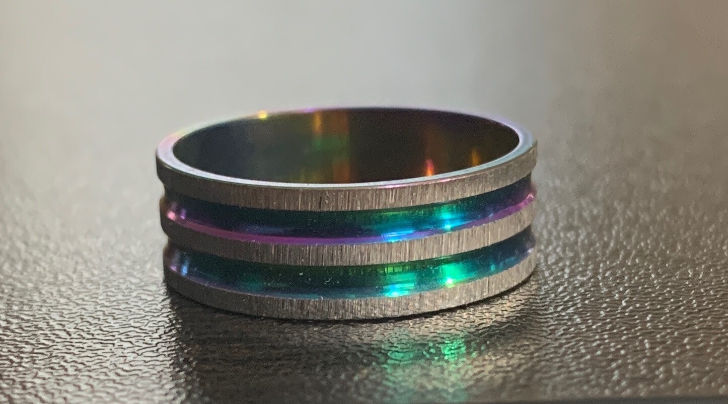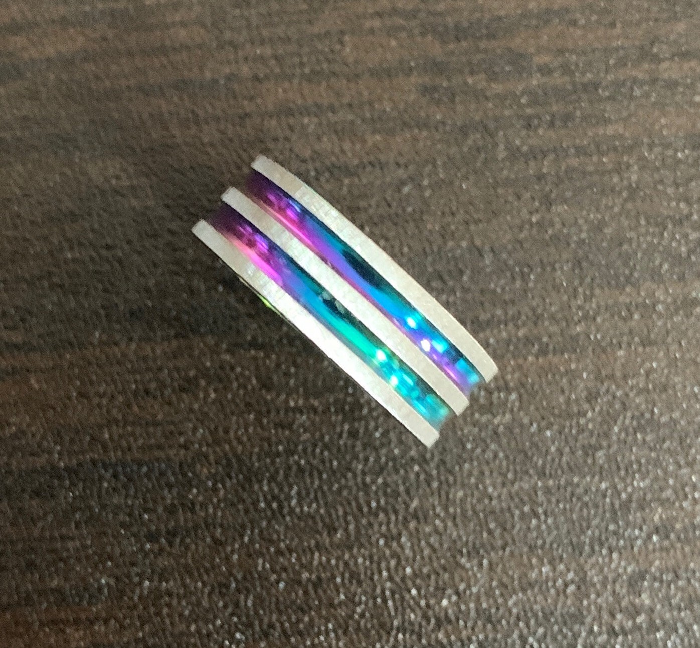как выглядит Silver Tone Fashion Ring With Rainbow Colored Iridescent Striped Grooves Size 9 фото