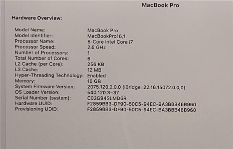 APPLE MACBOOK PRO 2019 A2141 i7 2.6GHz 16 16GB 1TB - Grade D