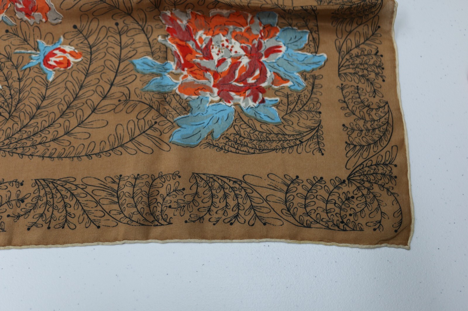 BEAUTIFUL Vintage Silk Scarf Hand Rolled Fall Autumn Leaves Rust Brown Blue 32