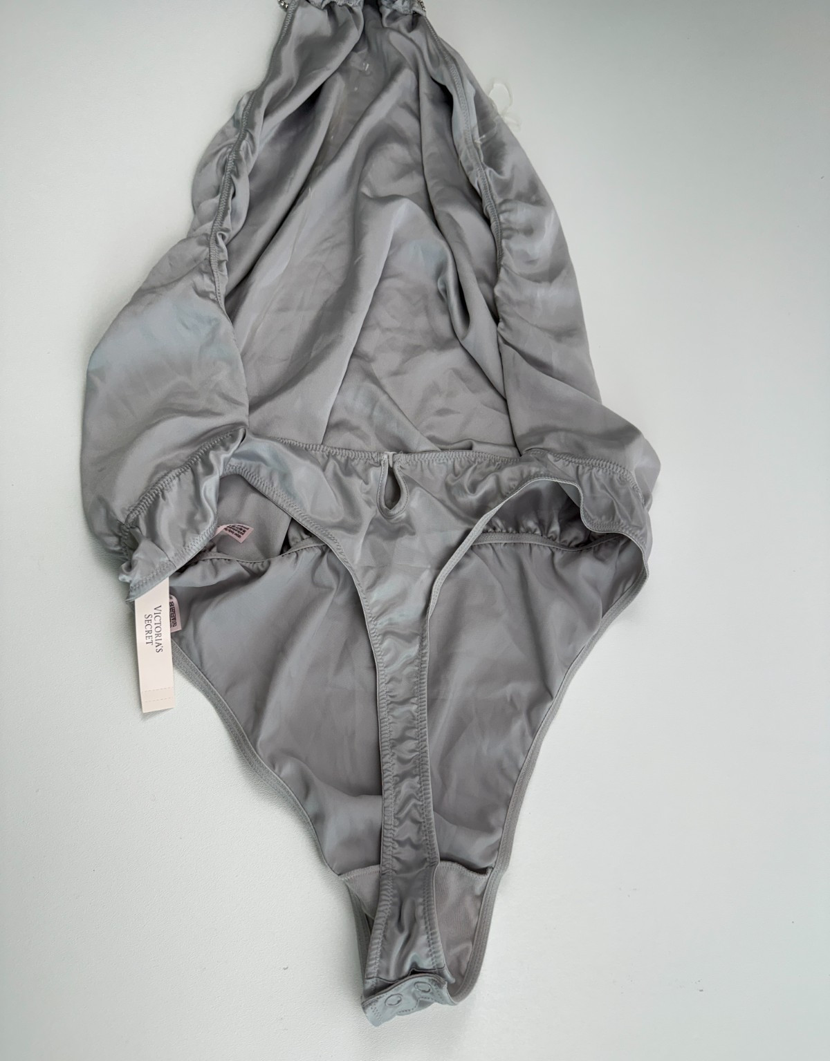 как выглядит Victorias Secret Satin Rhinestone Strap Teddy Snap On Bodysuit Gray XXL NWT фото