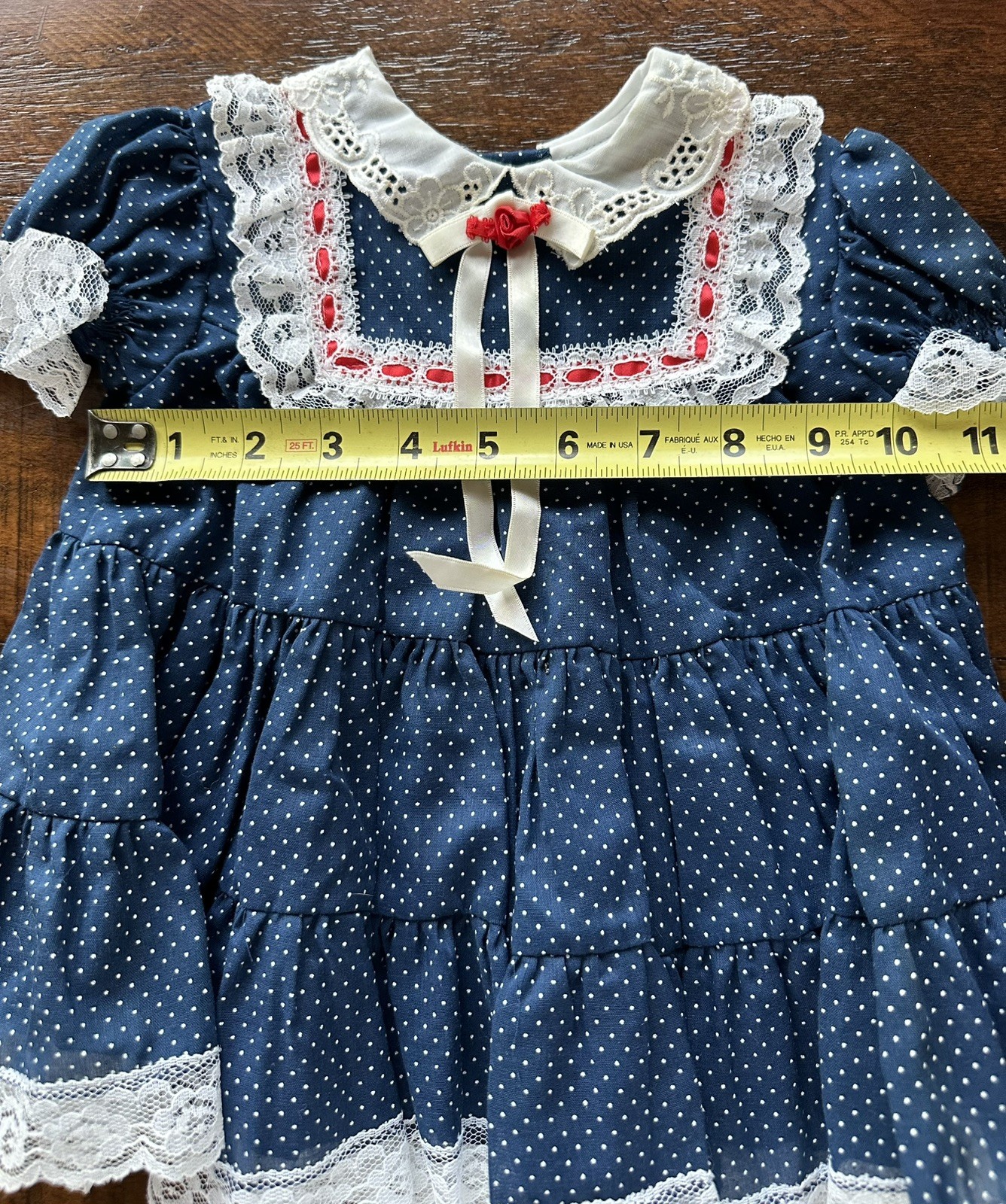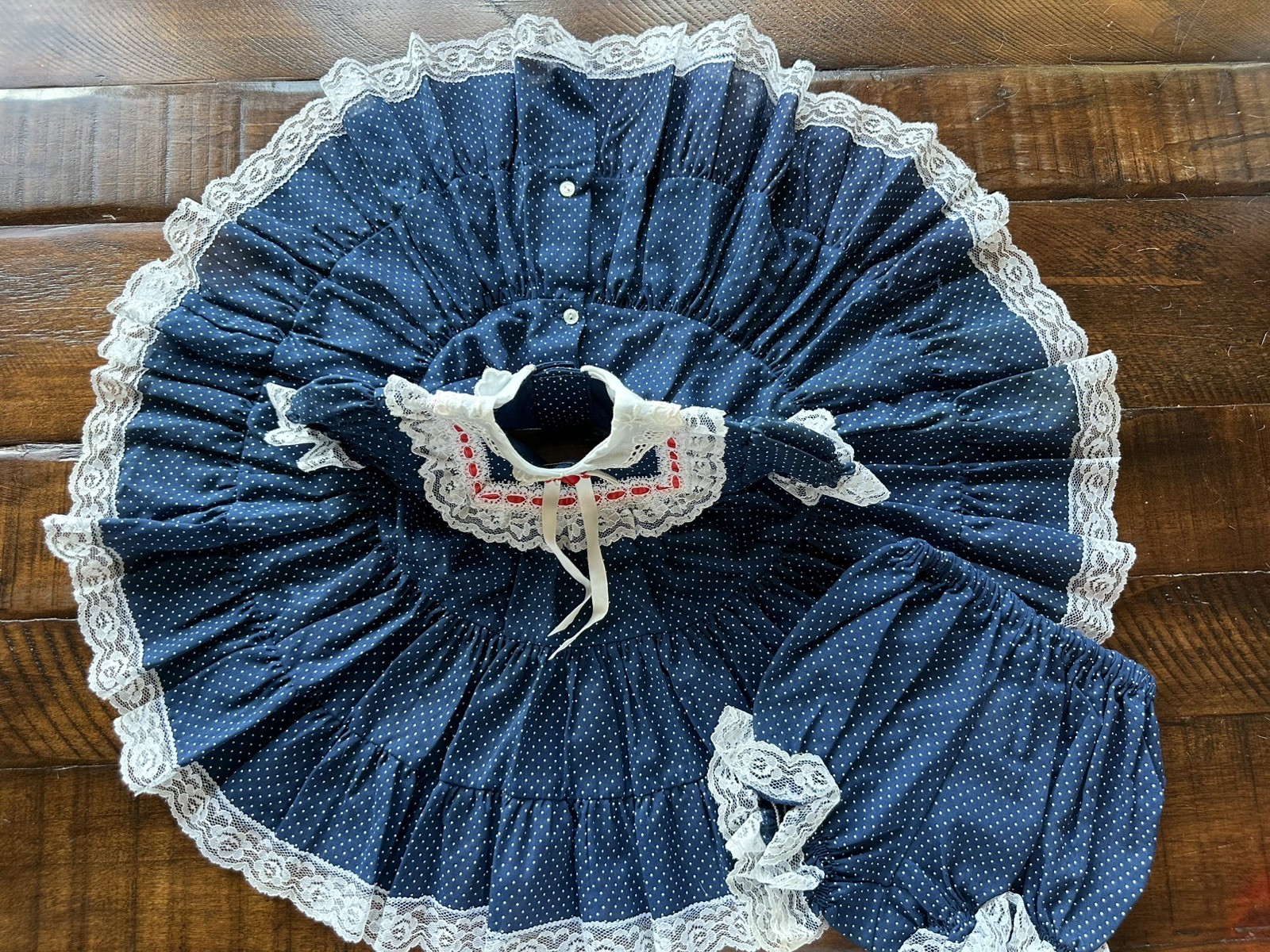 EUC Vintage Bryan Blue White Dots Baby Girl 6-9 Mo Full Circle Ruffle Dress