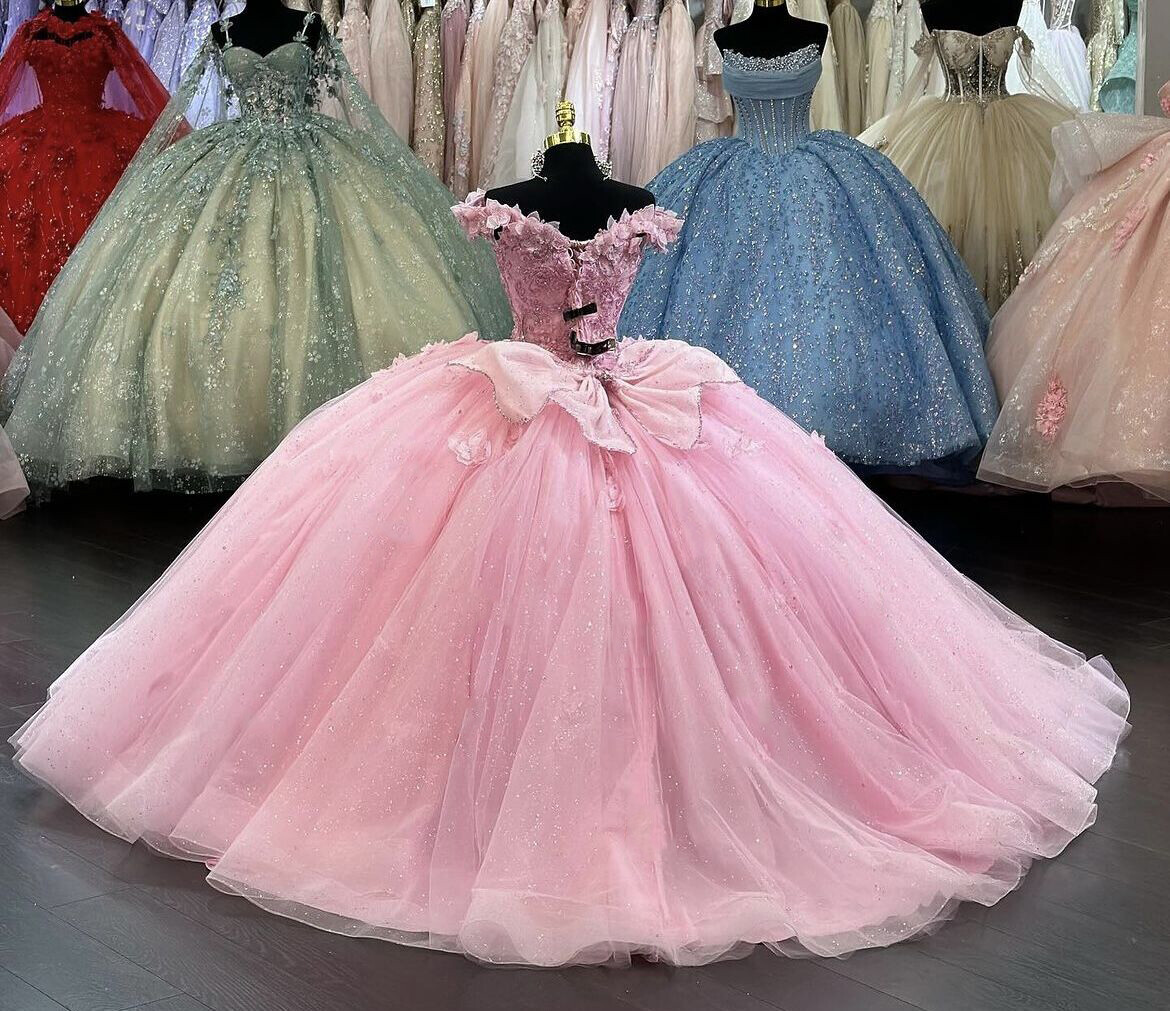 как выглядит Pink Quinceanera Dresses Off Shoulder Lace 3D Floral Beaded Ball Gowns Sweet 15 фото