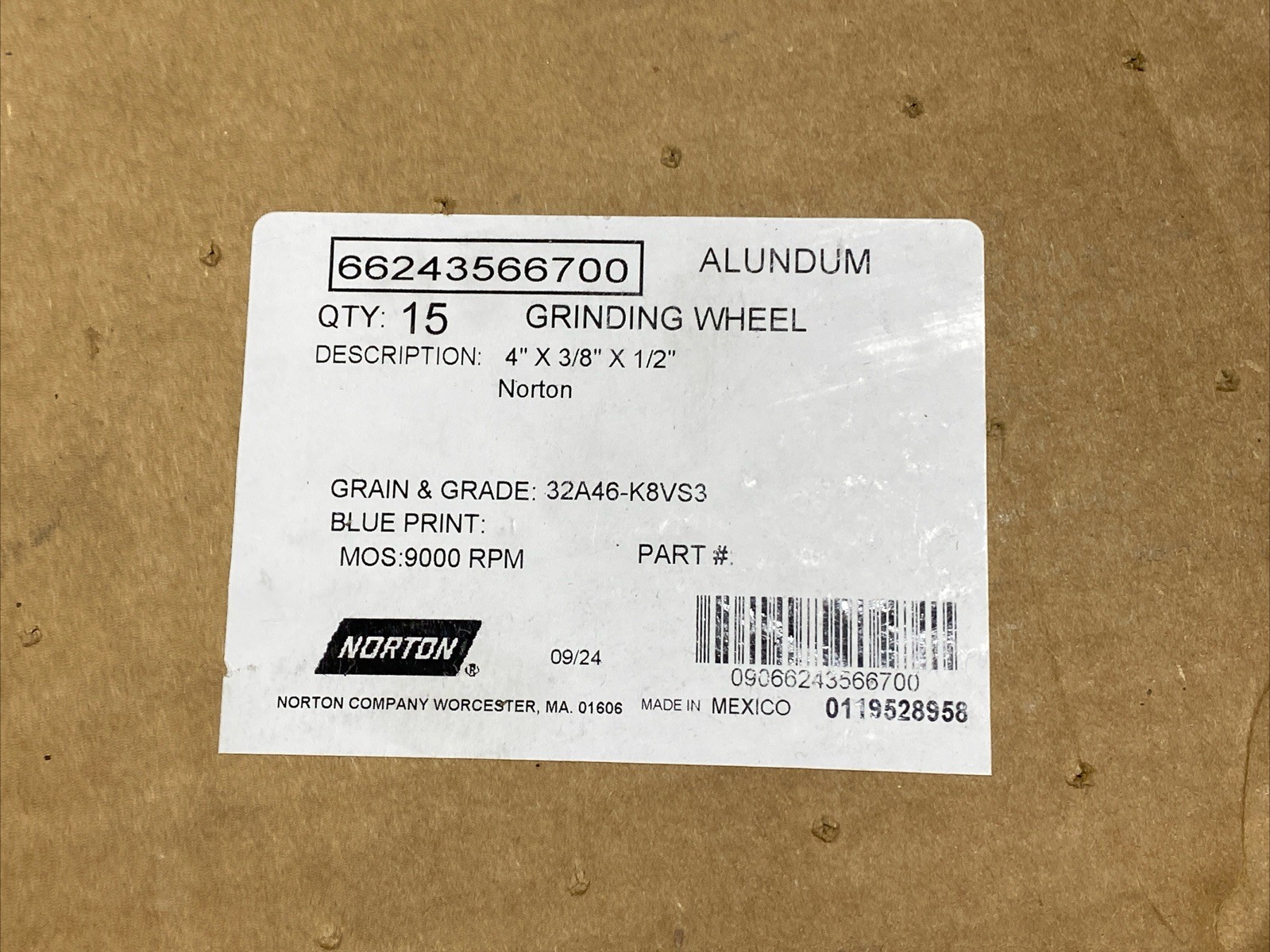 NORTON 32A46-K8VS3 4x3/8x1/2 Grinding Wheel Wheels Lot of 15 New