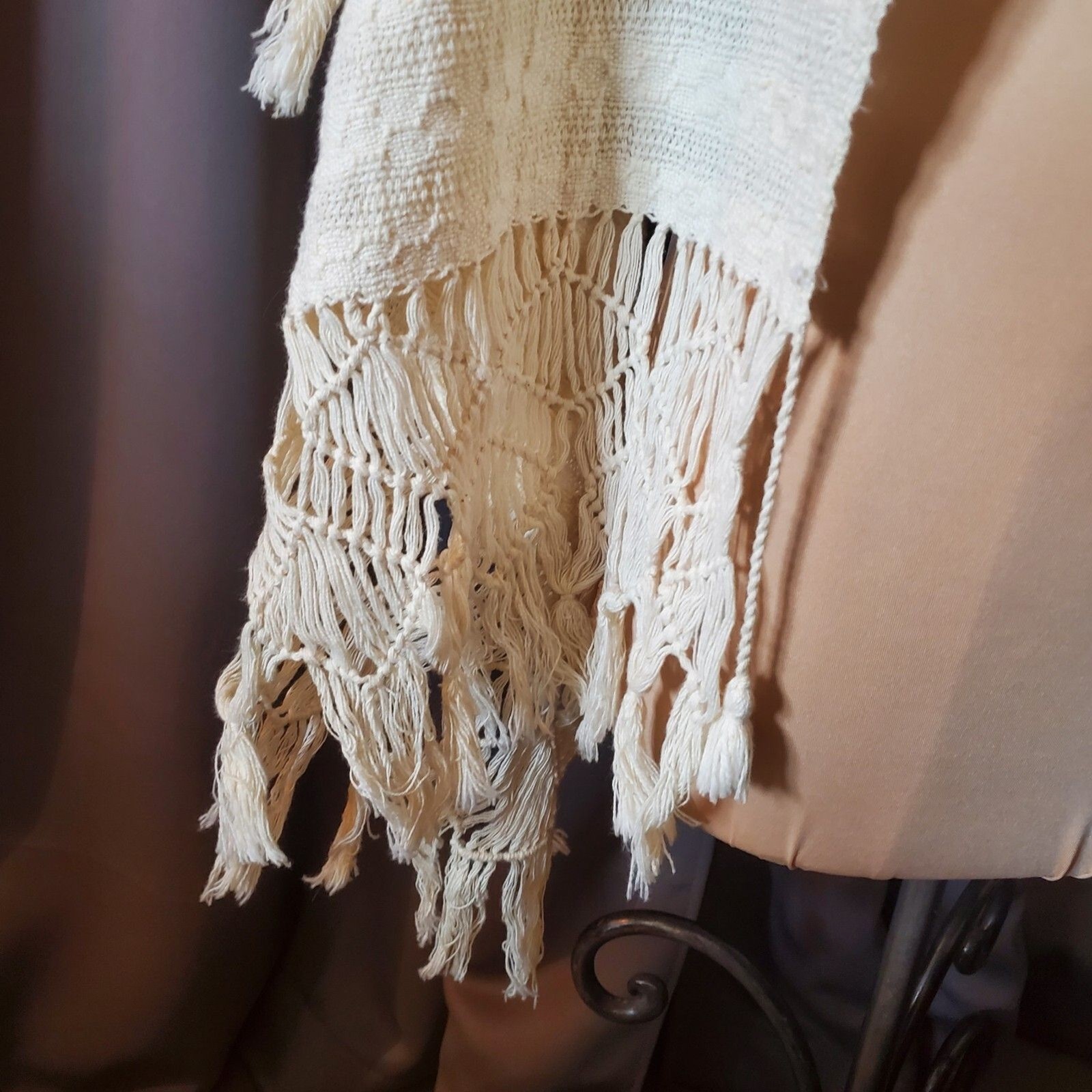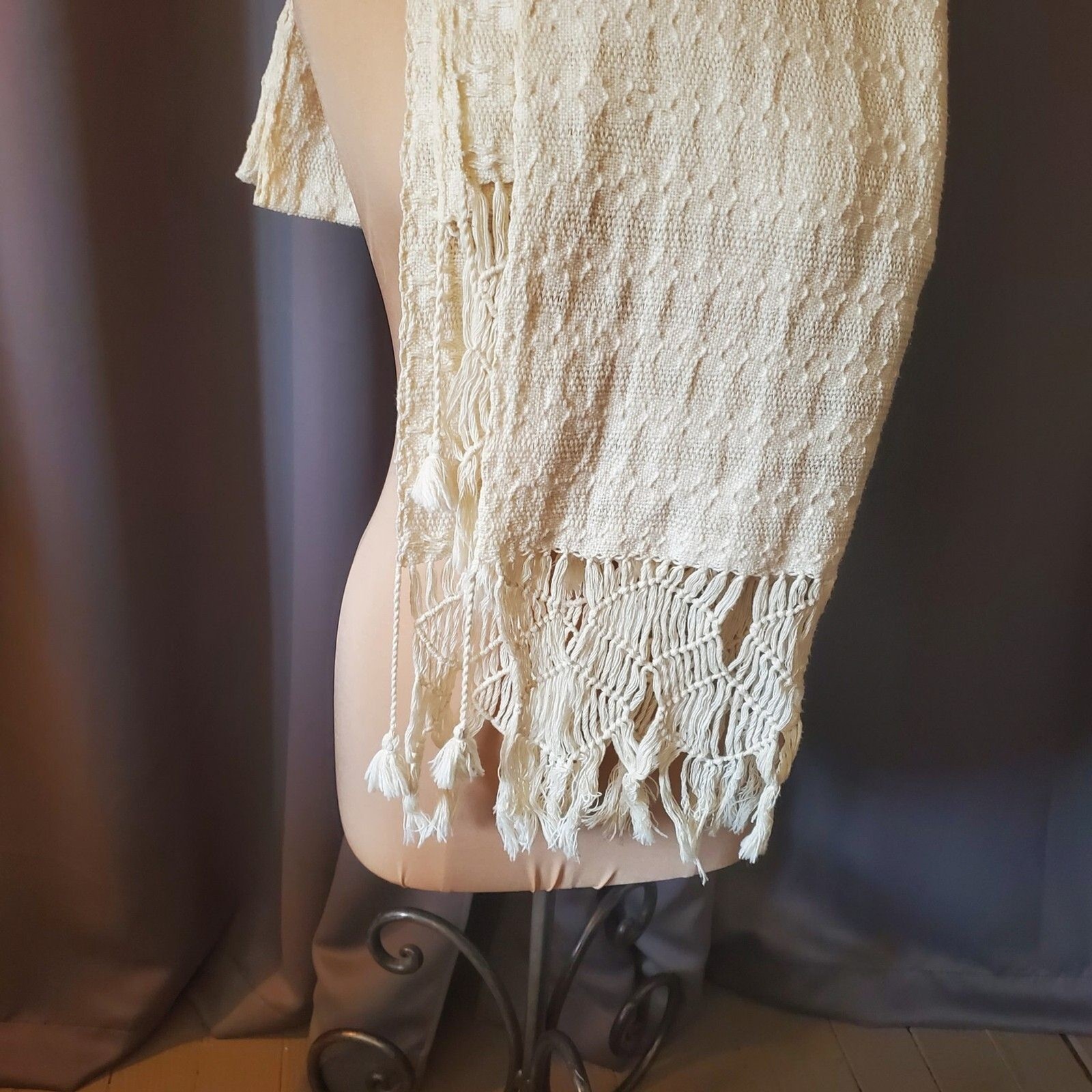 Off-White Cream Weave Shawl Scarf Wrap w/ Fringe - Boho, Natural, Vintage Vibe