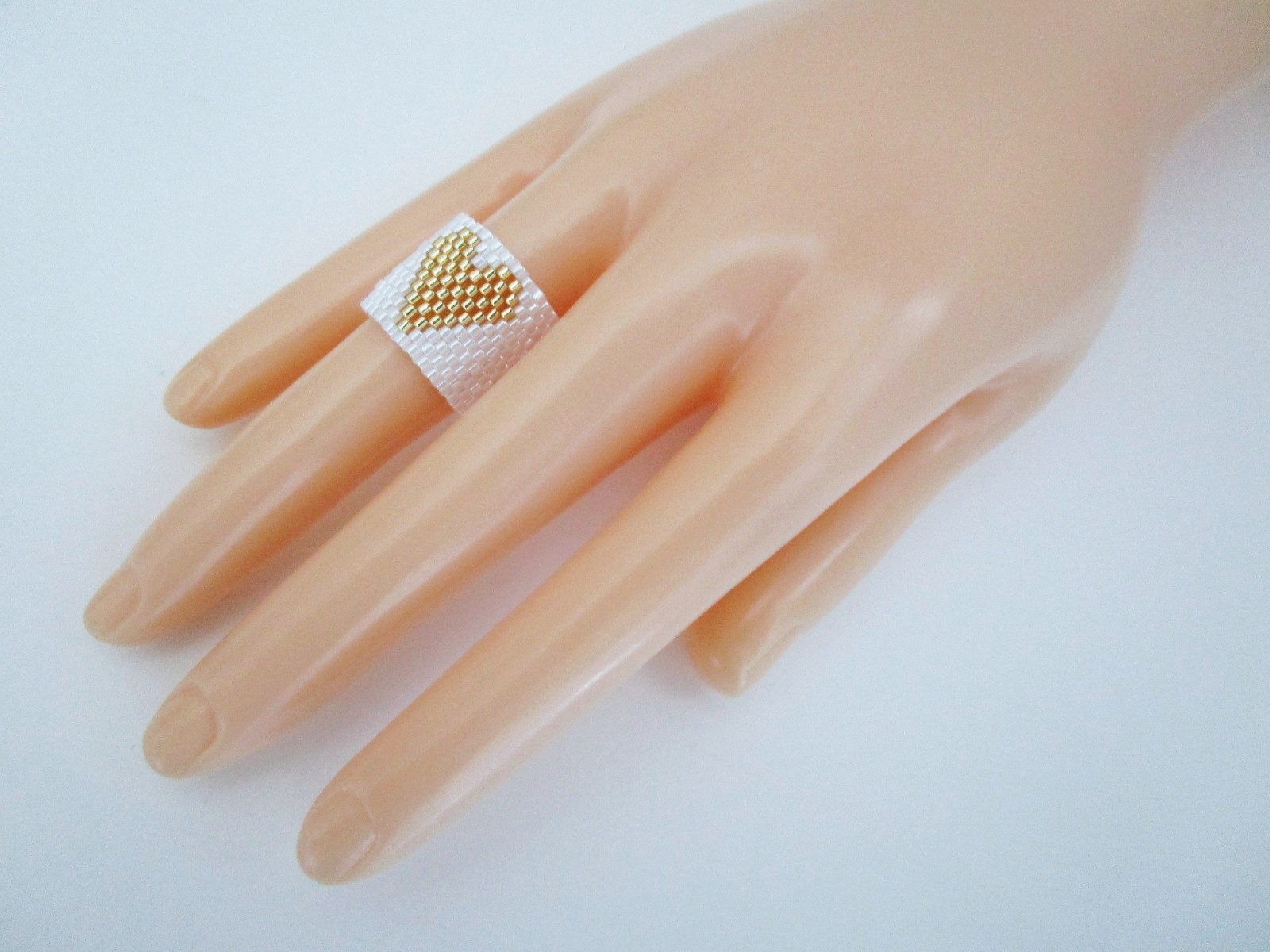 Gold and White Seed Bead Heart Ring / Beaded Peyote Jewelry / Size 7