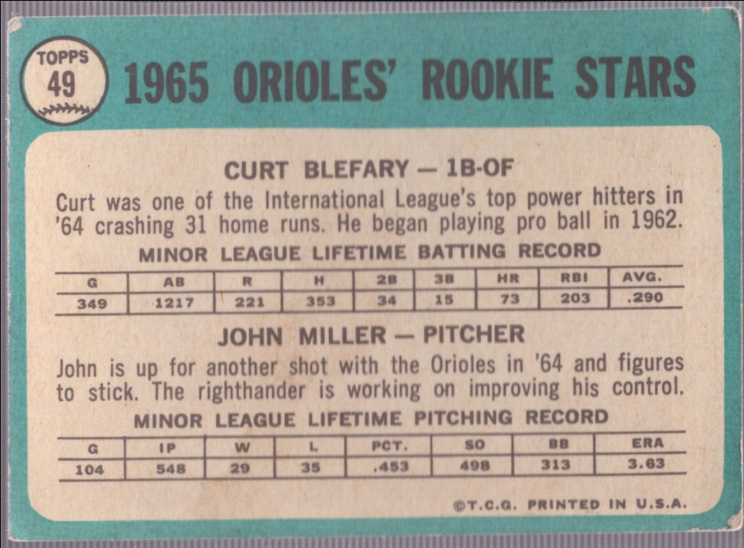• 1965 Topps Baseball Orioles 1965 Rookie Stars Curt Blefary / John Miller RS VG