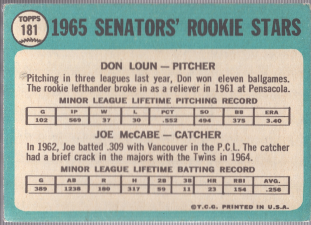 1965 Topps Baseball Senators 1965 Rookie Stars Don Loun / Joe McCabe RS, RC PR