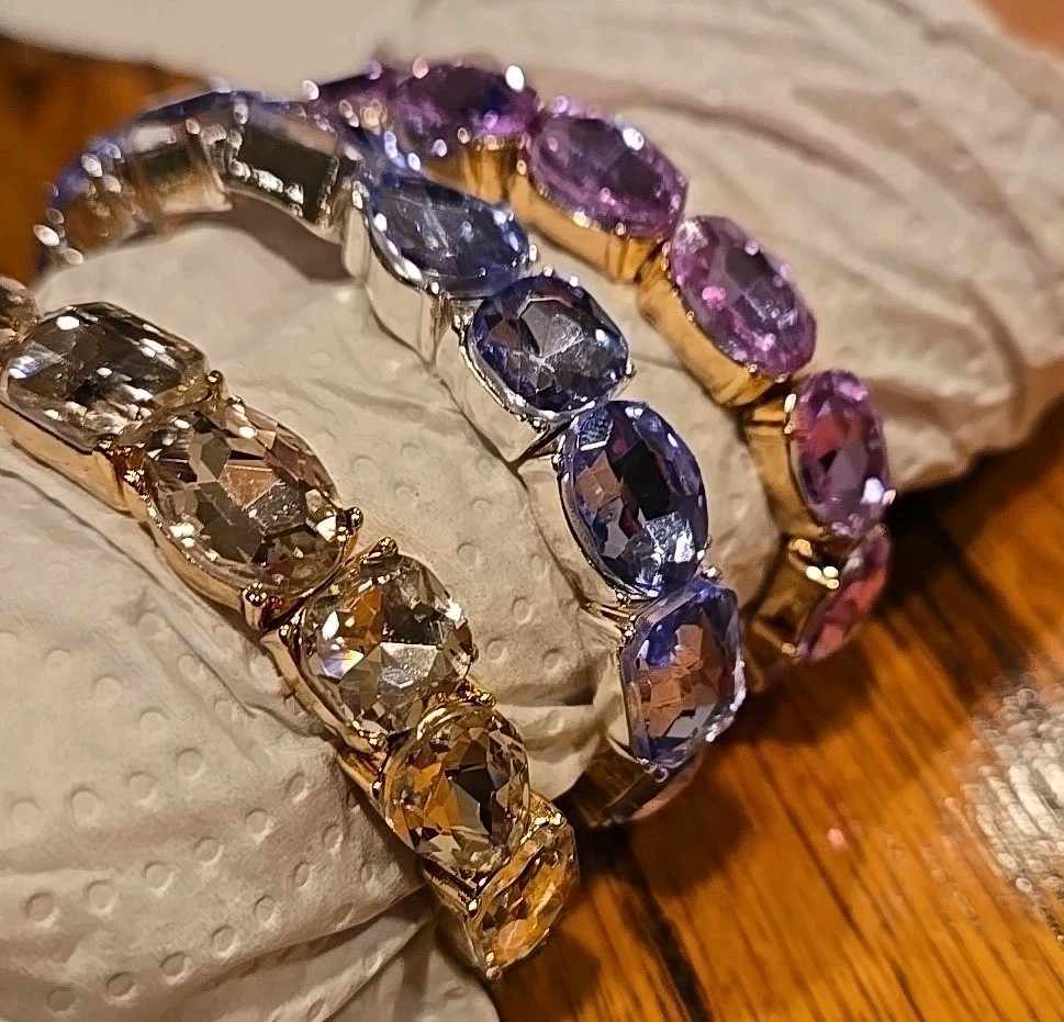 Set Of 3 Rhinestone Stud Stretchy Bracelets Pink Blue Purple Gold Silver Wrist
