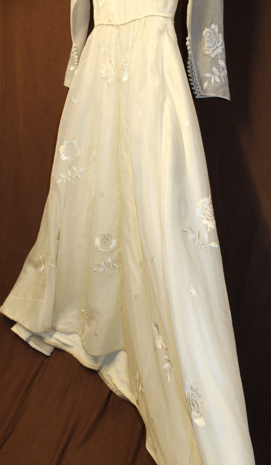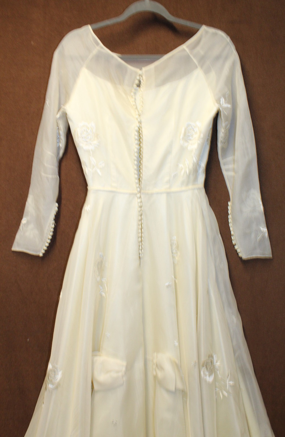 как выглядит 1950 s  1960 s LONG SLEEVE WEDDING DRESS W/ FLORAL SILVER METALLIC EMBROIDERY фото