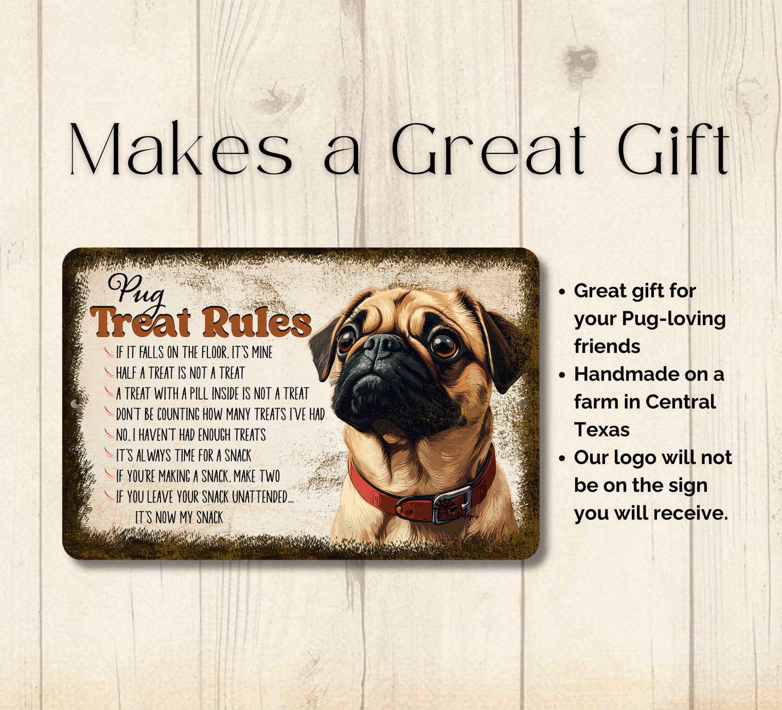 • Pug Treat Rules Sign dog snack metal tin funny wall art gift decor handma