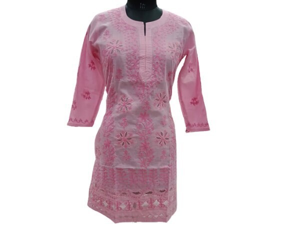 Pink Lucknowi Chikankari Kurti for Women Handmade Cotton Embroidered Top