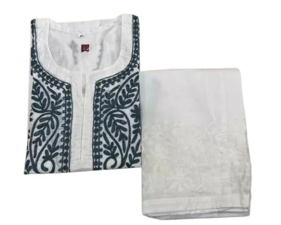 как выглядит White Cotton Chikankari Kurti Set for Women Handmade Lucknowi Embroidery фото