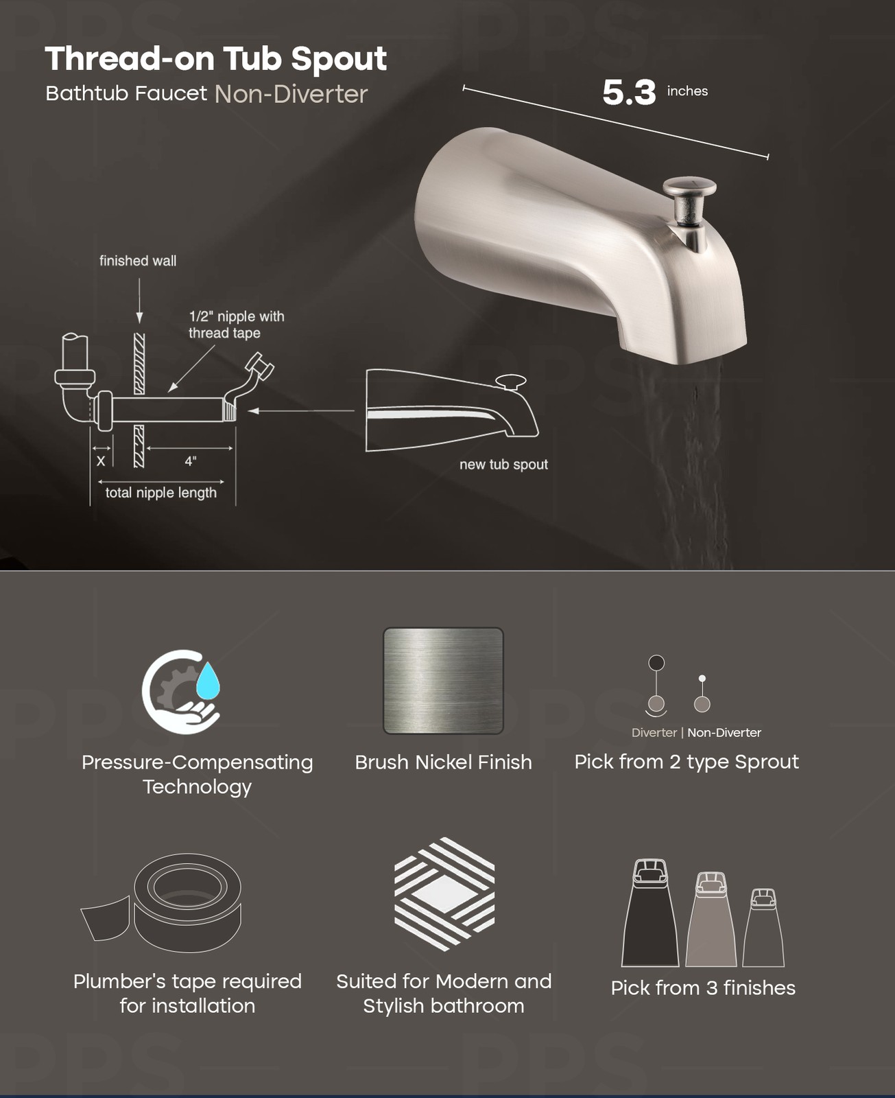 Tub Spout 1/2 FIP Nose Thread Bathtub Faucet with Diverter Brushed Nickel