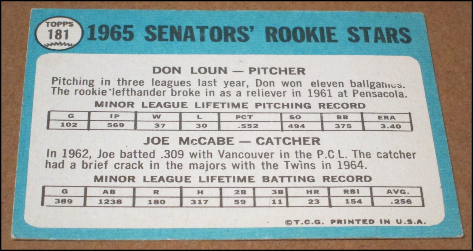 • 1965 Topps Washington Senators Rookie Stars Don Loun Joe McCabe Card 181 EX RC