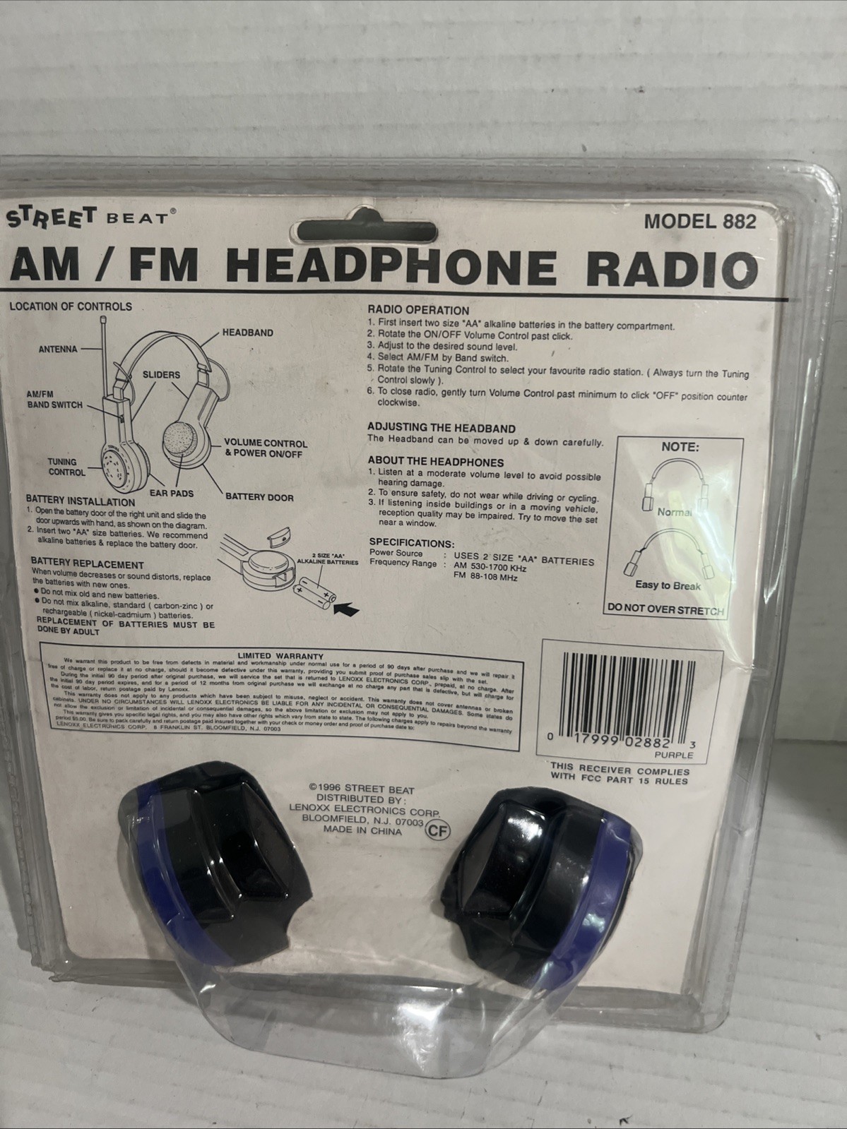 Vintage 1996 AM/FM Street Beat Headphone Radio Lenoxx Model 882 Purple/Black