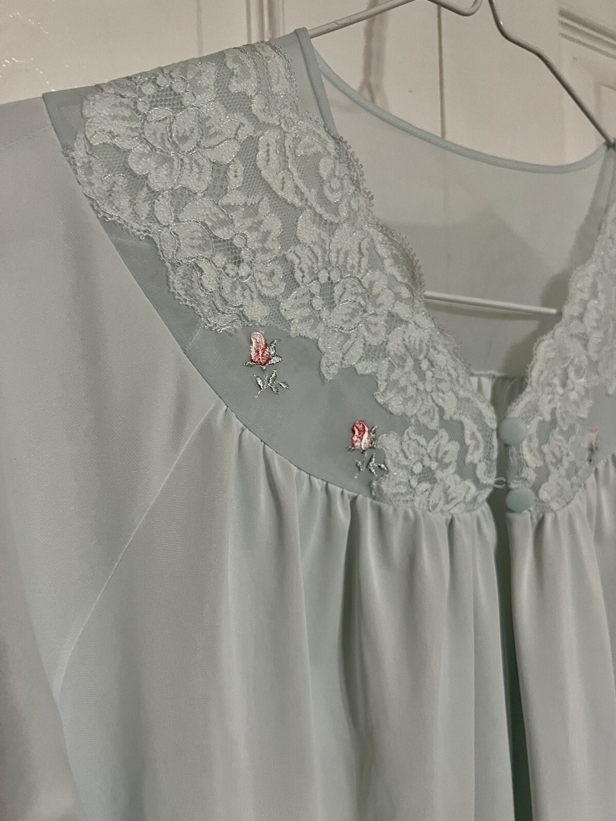 как выглядит Shadowline Vintage Bed Jacket S Blue Lace Sheer Yoke Rosebuds Covered Buttons фото