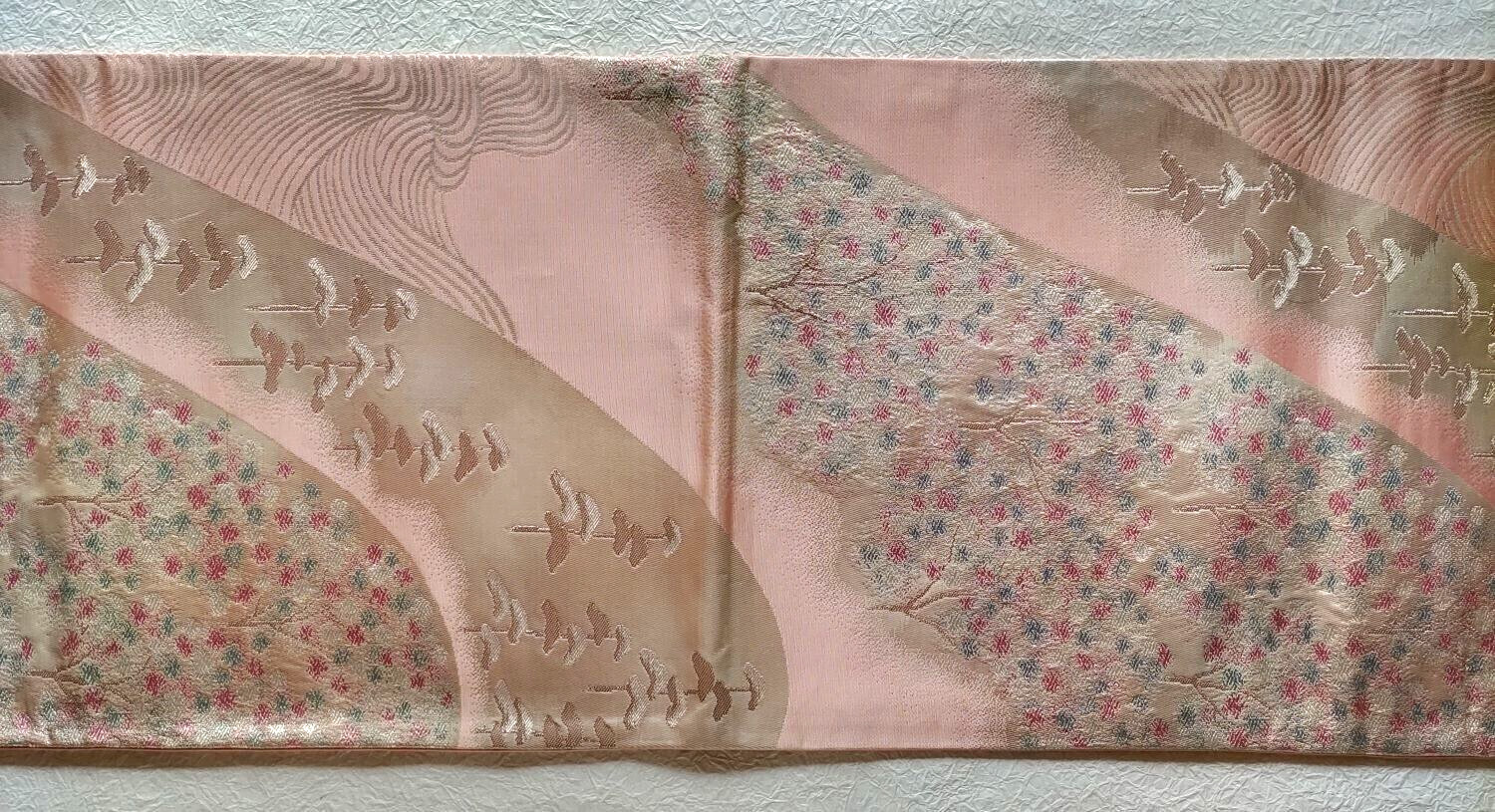 • Japanese Vintage Kimono Fukuro Obi Silk Pink Silver Blue Mountain Wave