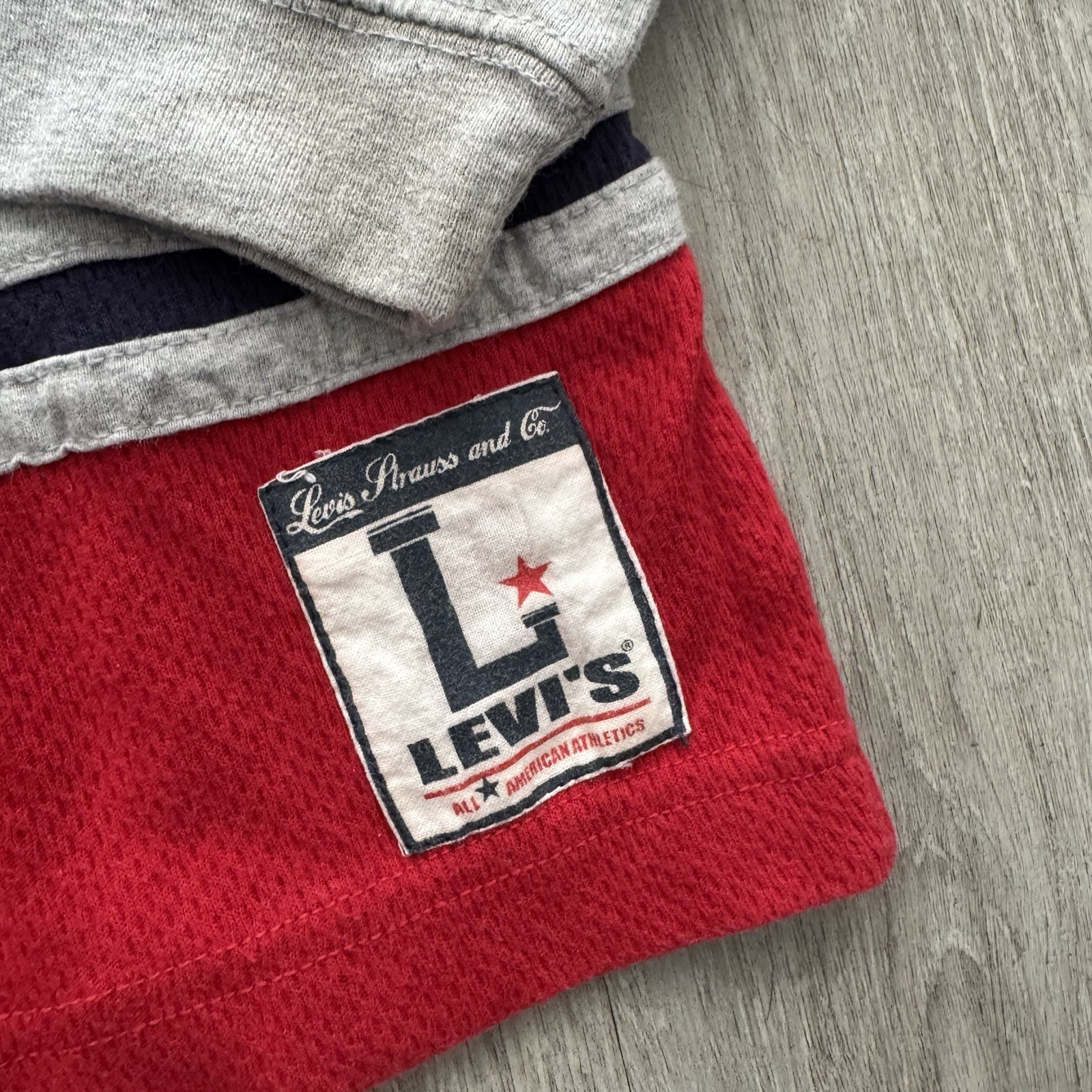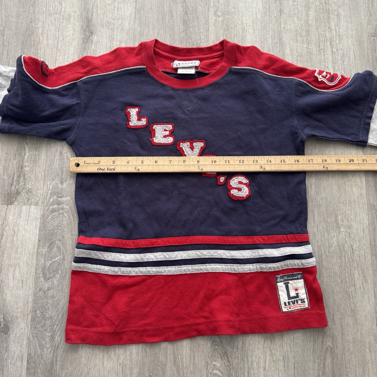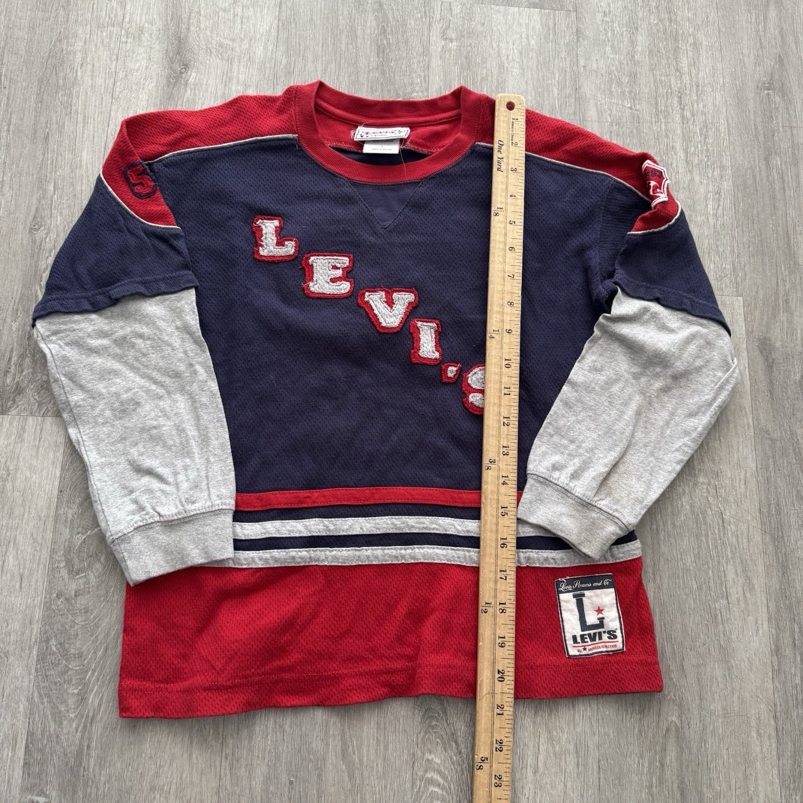 как выглядит Vtg Levis Kids Levis Pullover Long Sleeve T Shirt Spellout Size 7 Multicolor фото