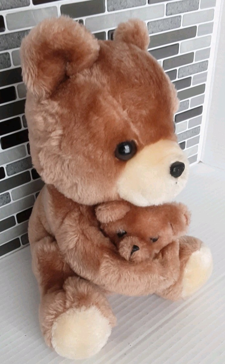 Vintage Dakin 1977 Mama Bear Sitting With detachable Baby Plush 10