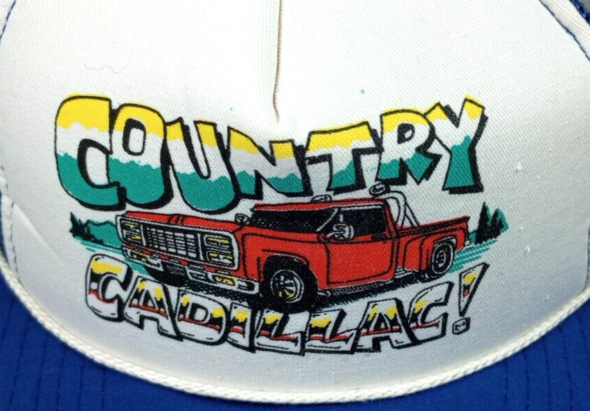Vintage Country Cadillac Trucker Hat Blue Mesh Snapback Corded Novelty Cap OSFA