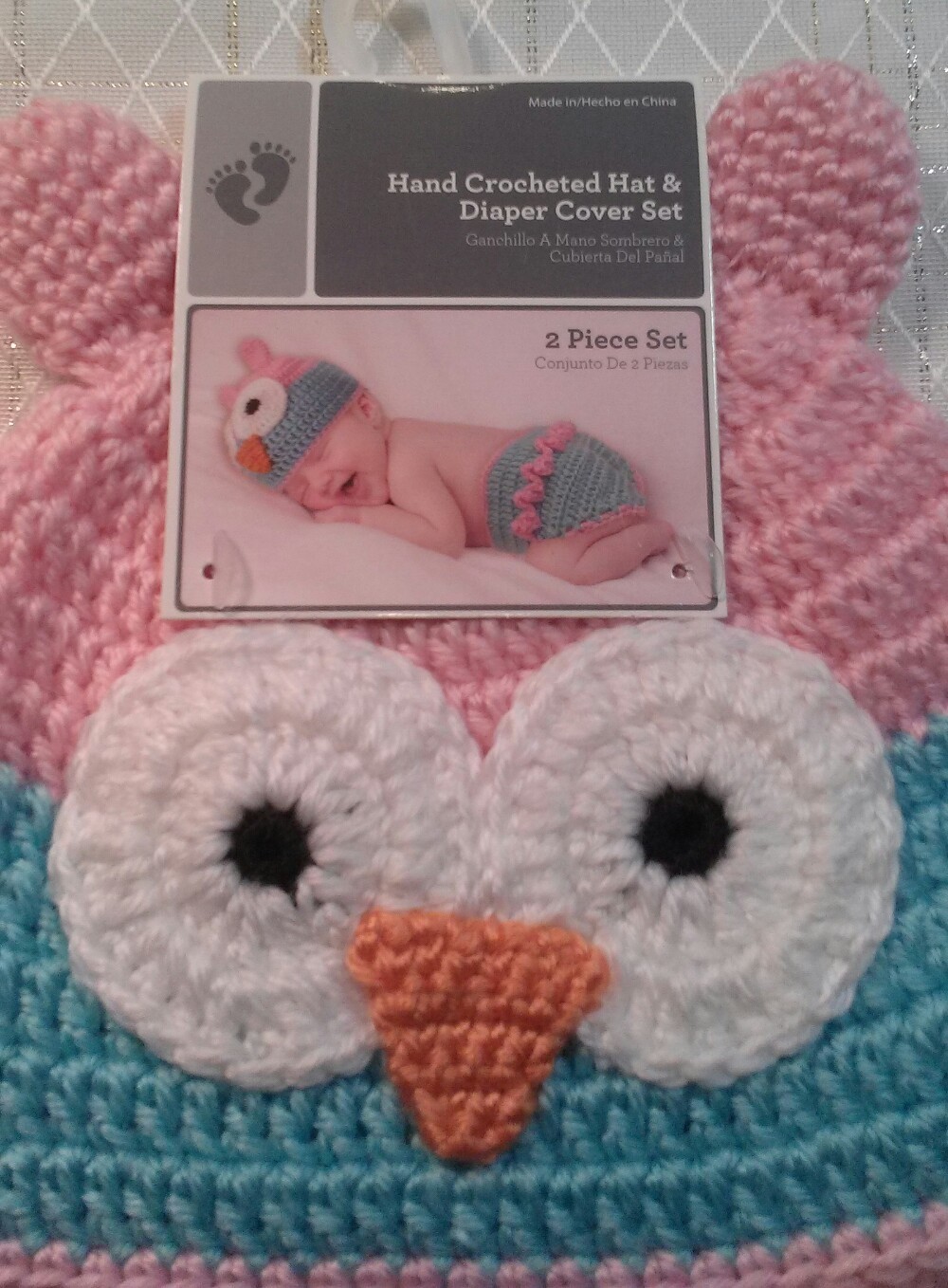 как выглядит NEW Baby Girl Infant Hat Diaper Cover 0-9m Hand Crocheted Owl 2pc Pink Aqua фото