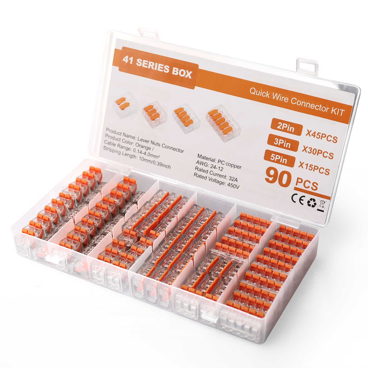 90-Pack 221-412 Lever Nut Connectors Compact Splicing Terminals 2/3/5 Port Set