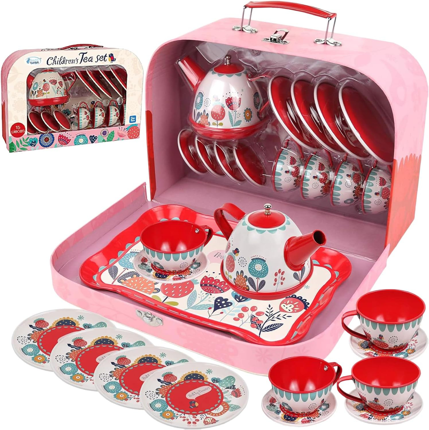 Tea Set for Little Girls, Pretend Play Tea Party Set, Floral Design Kids Tin Tea