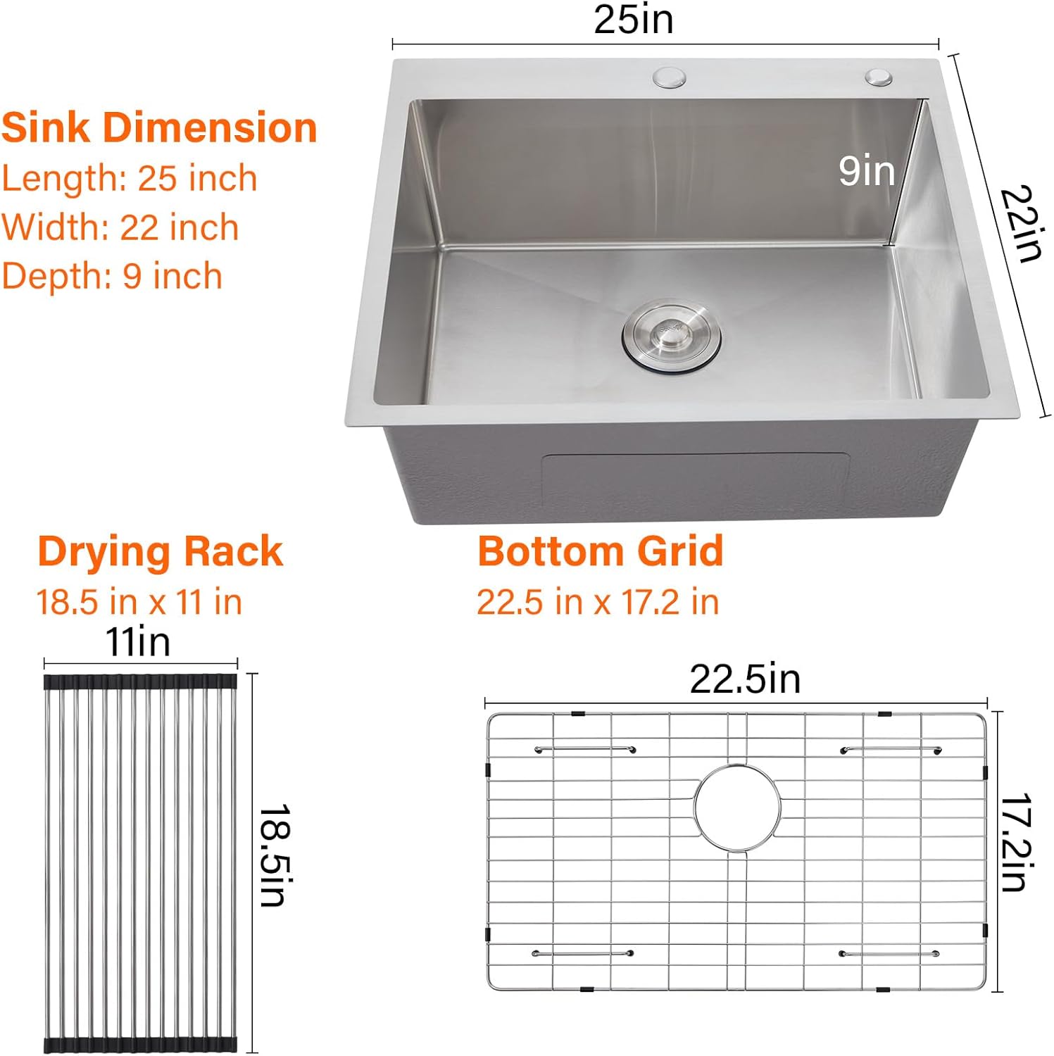 33x22/25x22in Drop in Kitchen Sink Top Mount Single Bowl Basin Stainless Steel