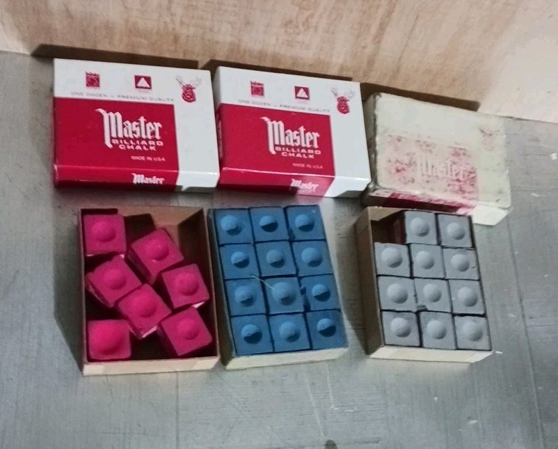 MASTER CHALK BILLIARD POOL CHALK. 3 NEW OPEN BOX. 11 BLUE, 7 RED 12 Gray