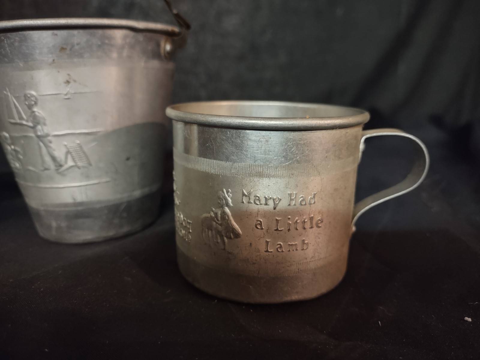 Vintage Lot Of 3 Aluminum Baby Kids Children Cups Bucket Nursery Rhymes More