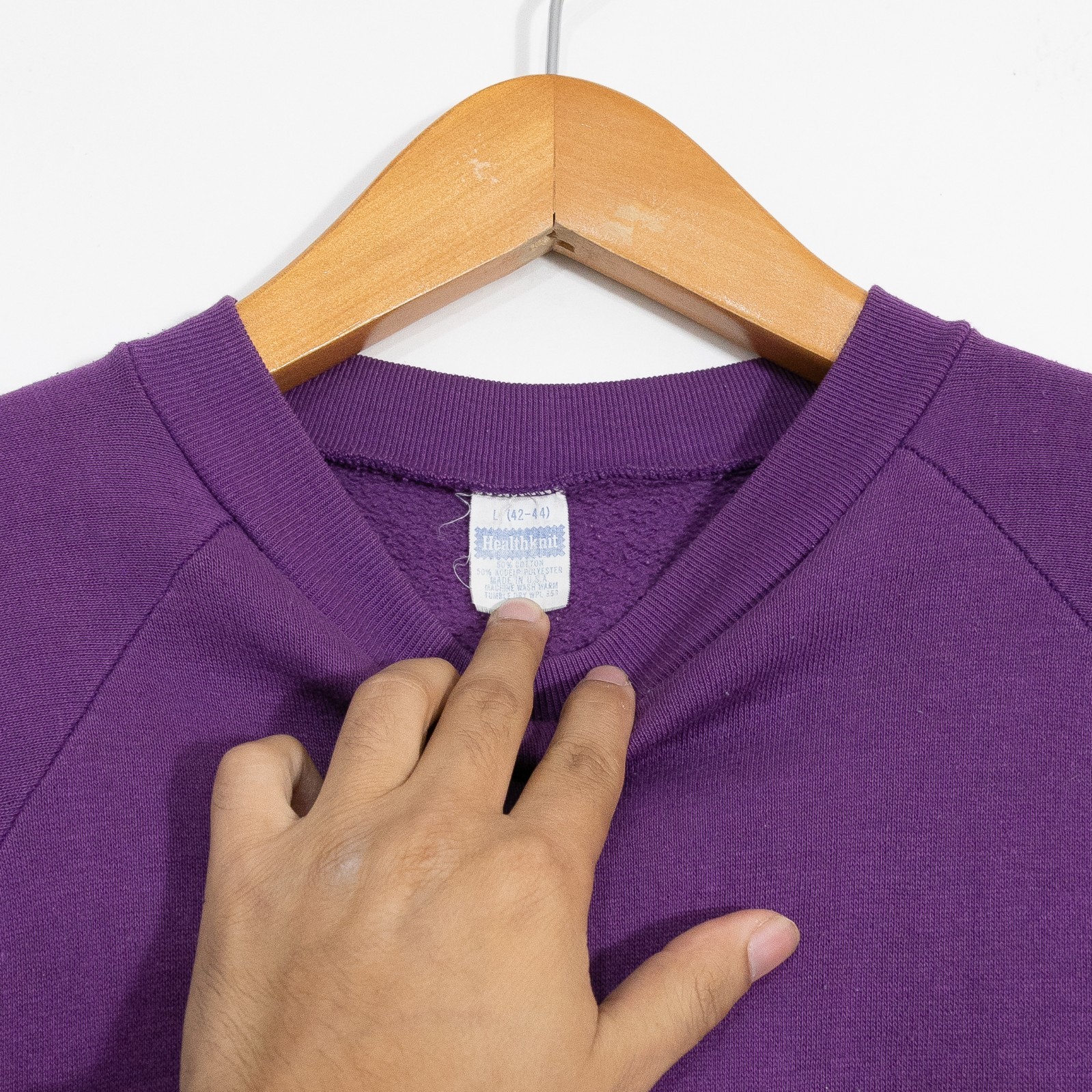 как выглядит Vintage 80s Healthknit Raglan Sweatshirt Large Crewneck Distressed Blank Purple фото
