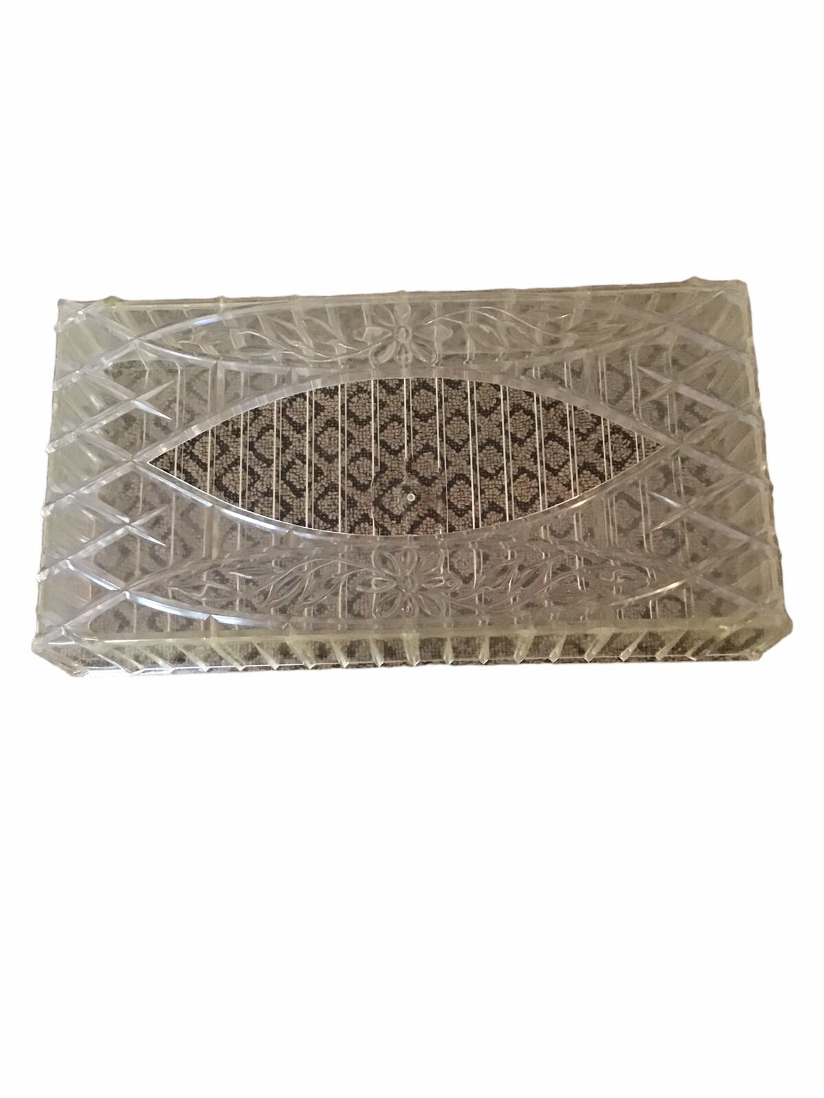 Vintage Clear Acrylic Tissue Box Holder Floral Diamond Striped Design. MCM.