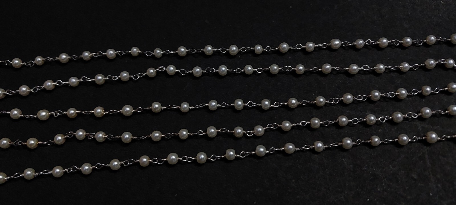 3 Feet Pearl Round Smooth 3-3.5mm Rosary Beaded Chain Silver Plated Wire Beads