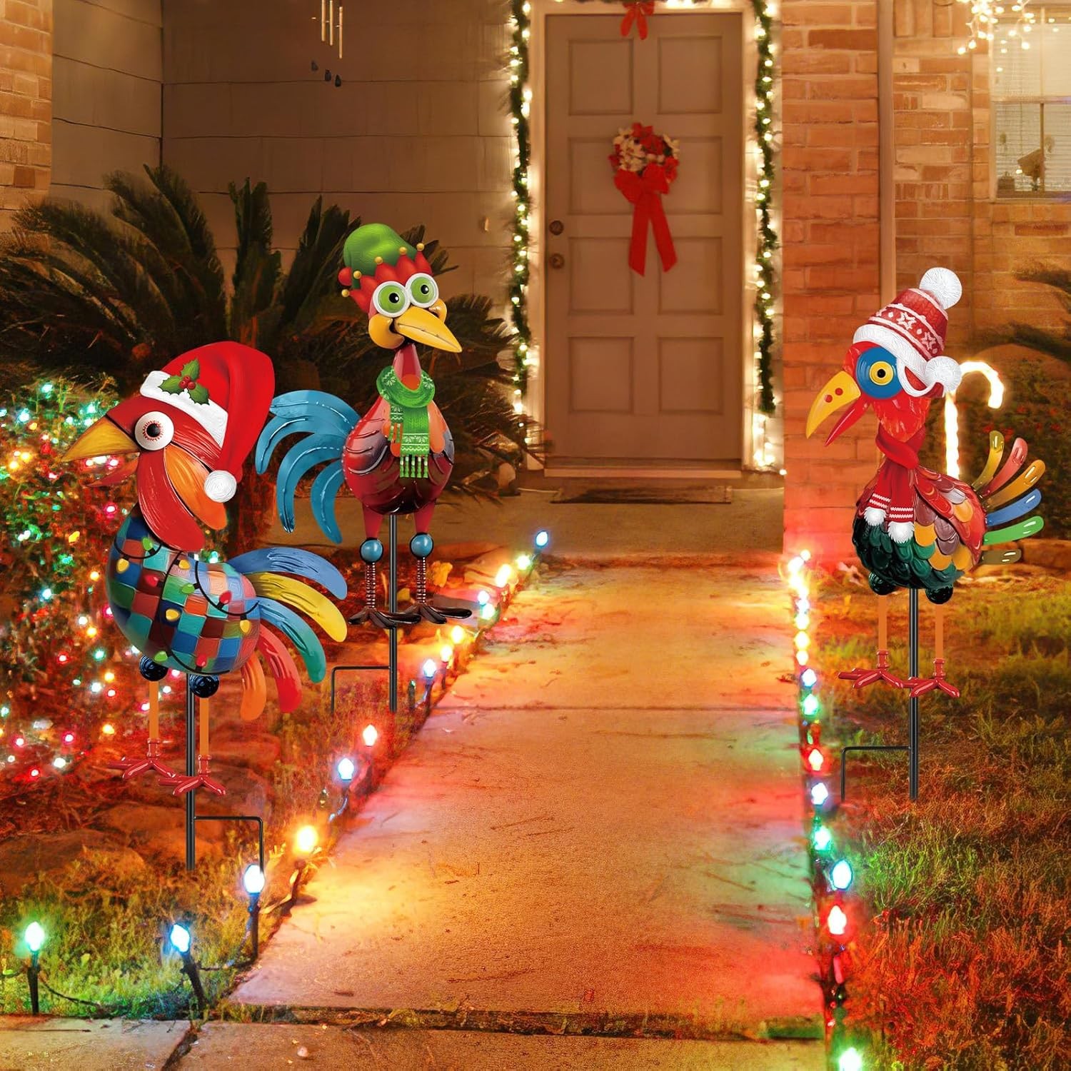 как выглядит 3 Pcs Christmas Chicken Outdoor Decorations Metal Multicolored фото