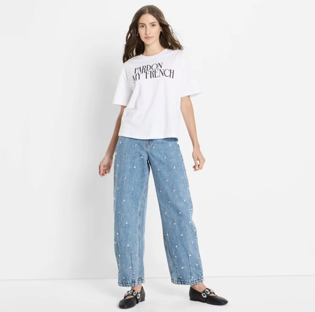 как выглядит Womens Mid-Rise Studded Barrel Leg Jeans - Target Future Collective jeans 6 фото