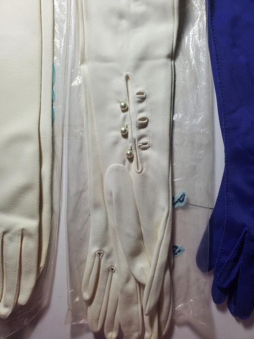 как выглядит 3 pair 1960s long Womens dress Gloves- 2 pr white, 1 pr blue фото