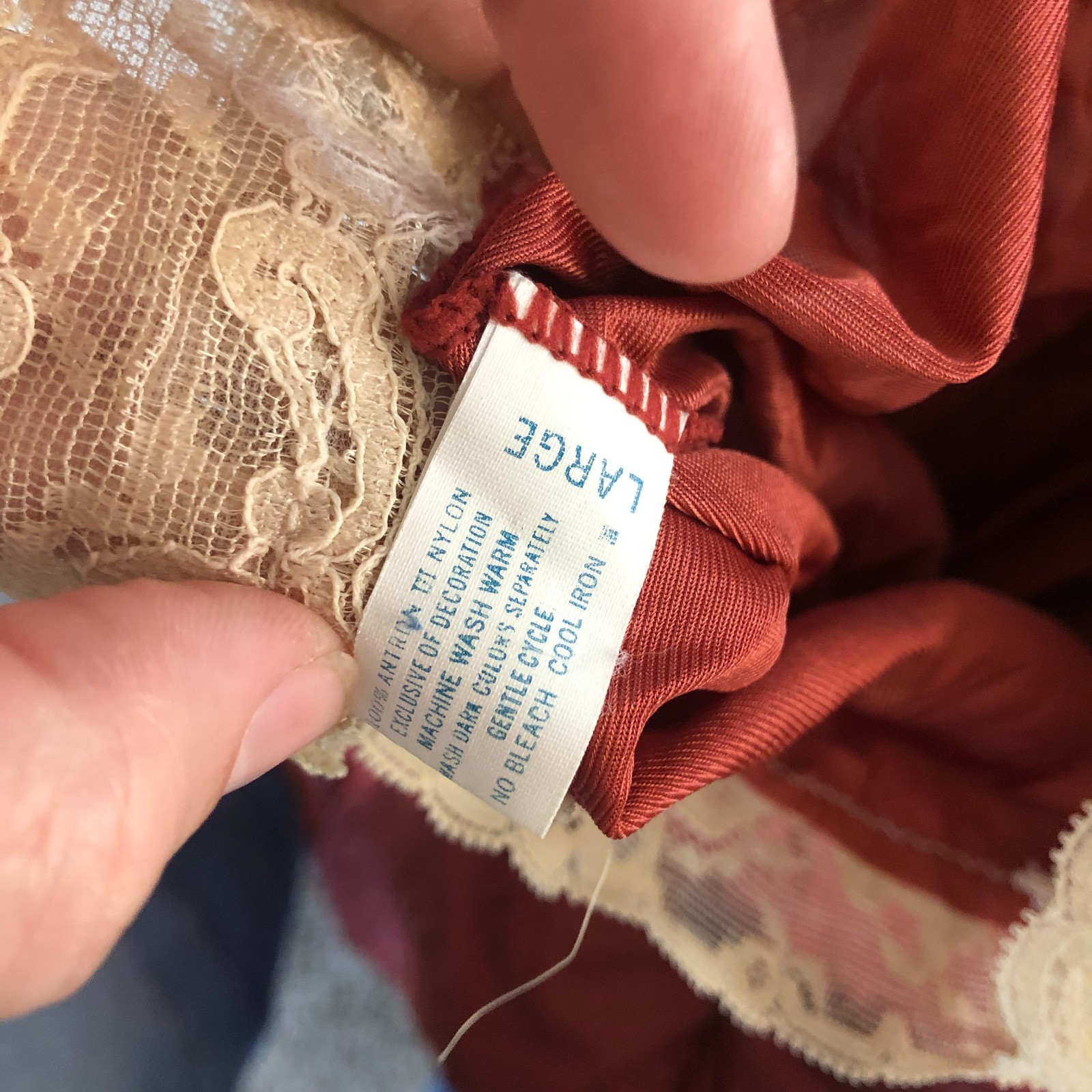 как выглядит Vtg KAYSER Made USA Rust Orange Beige Lace Nightgown Dress Boho Tie Slip Large фото
