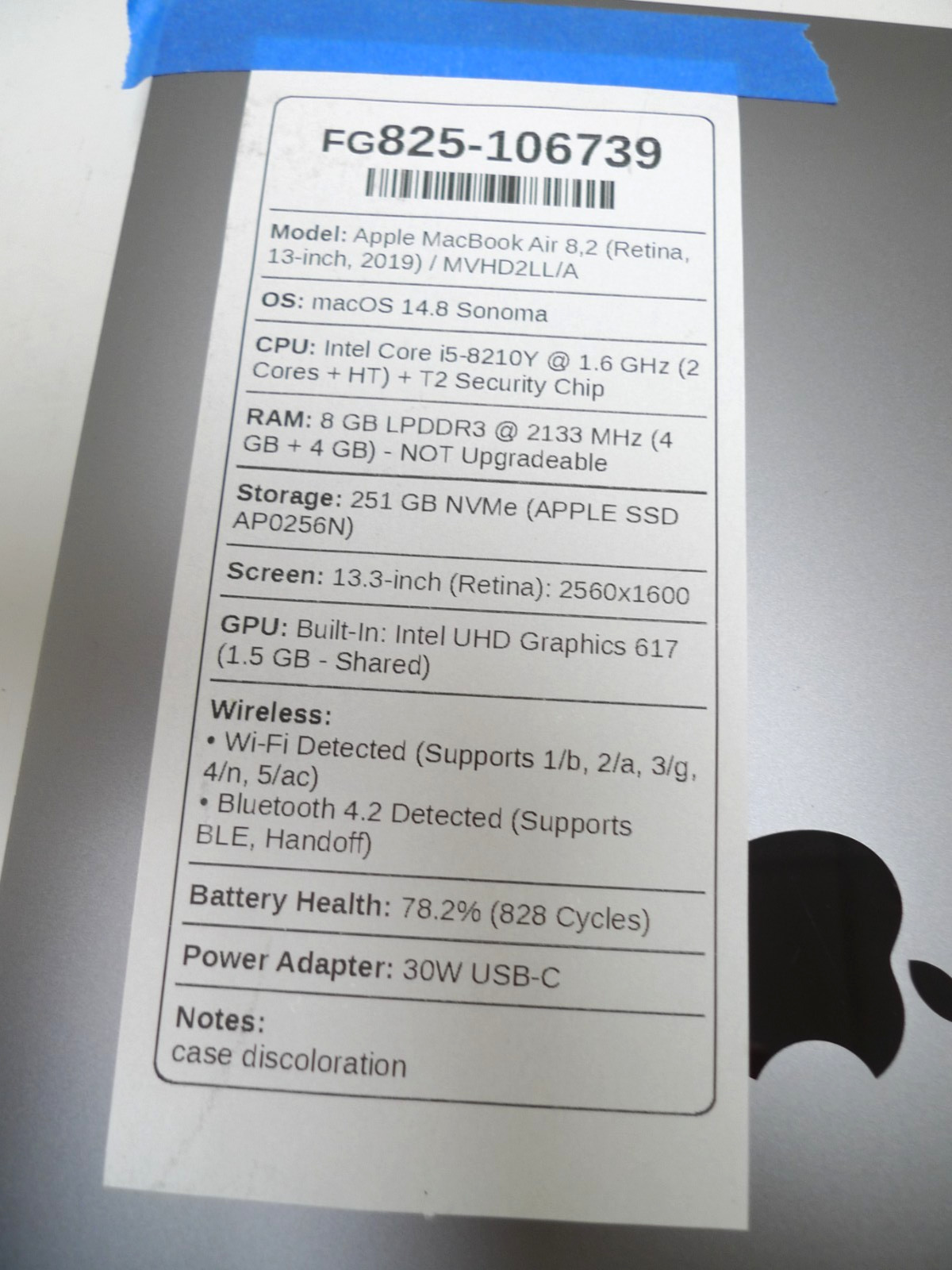 MacBook Air 13 2019 i5-8210Y 8GB RAM 256GB NVMe 828 Cycles Read