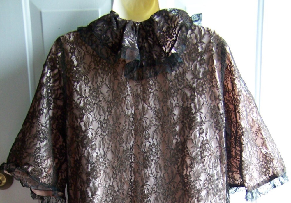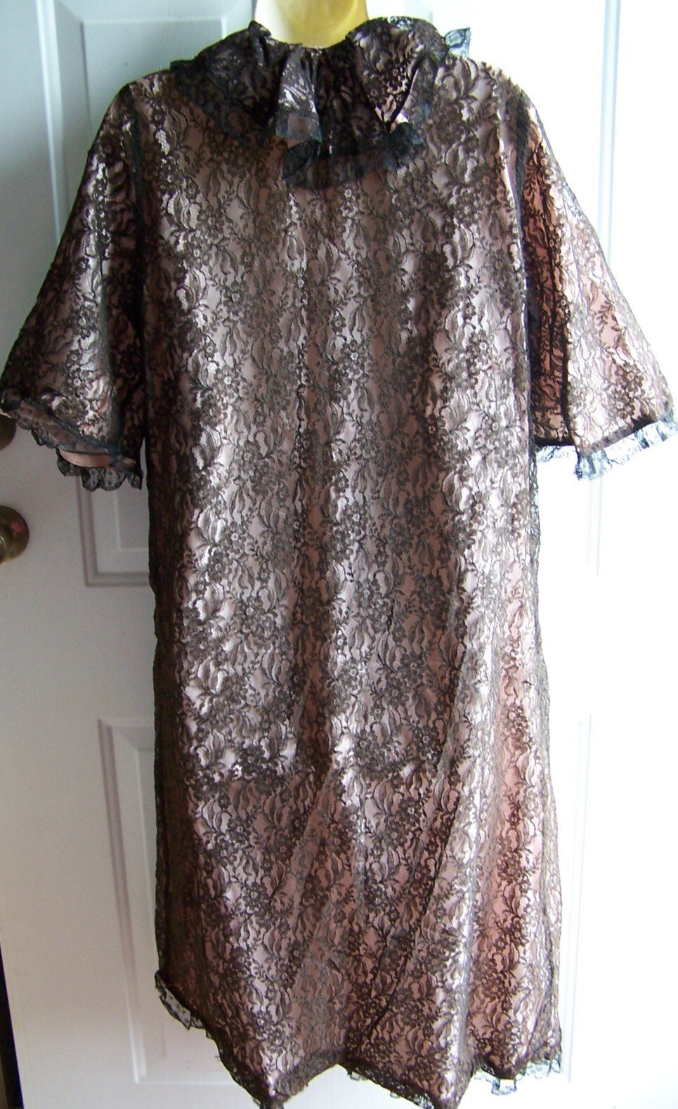 как выглядит Vtg Black MCM Peignoir ROBE Lingerie Knee Length Black Lace over Pink Lining фото