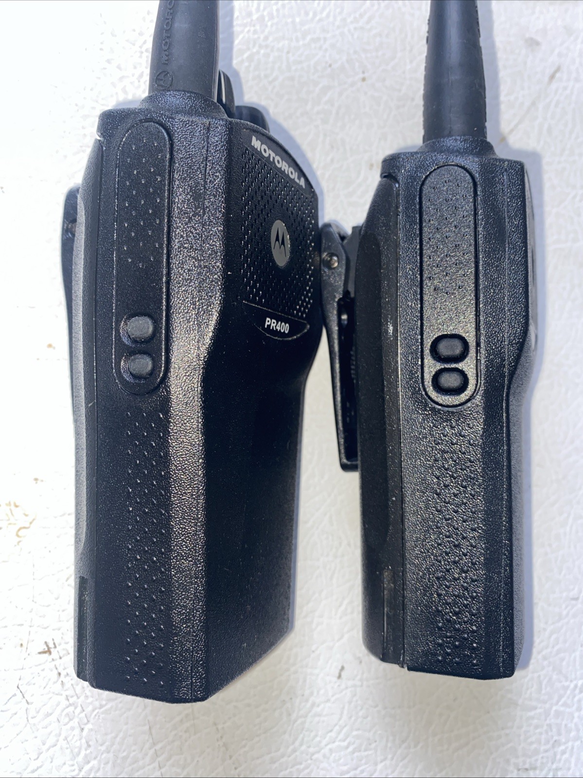2 Motorola PR400 UHF 16 Channel Two-Way Radios AAH65RDC9AA2AN Chargers Batteries