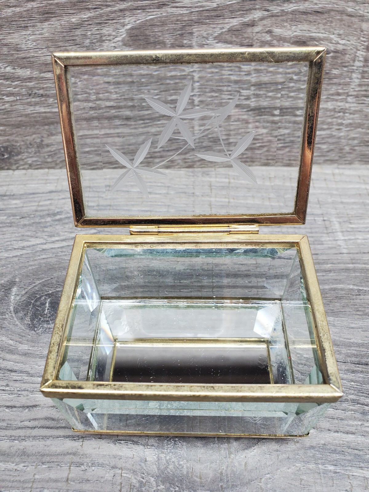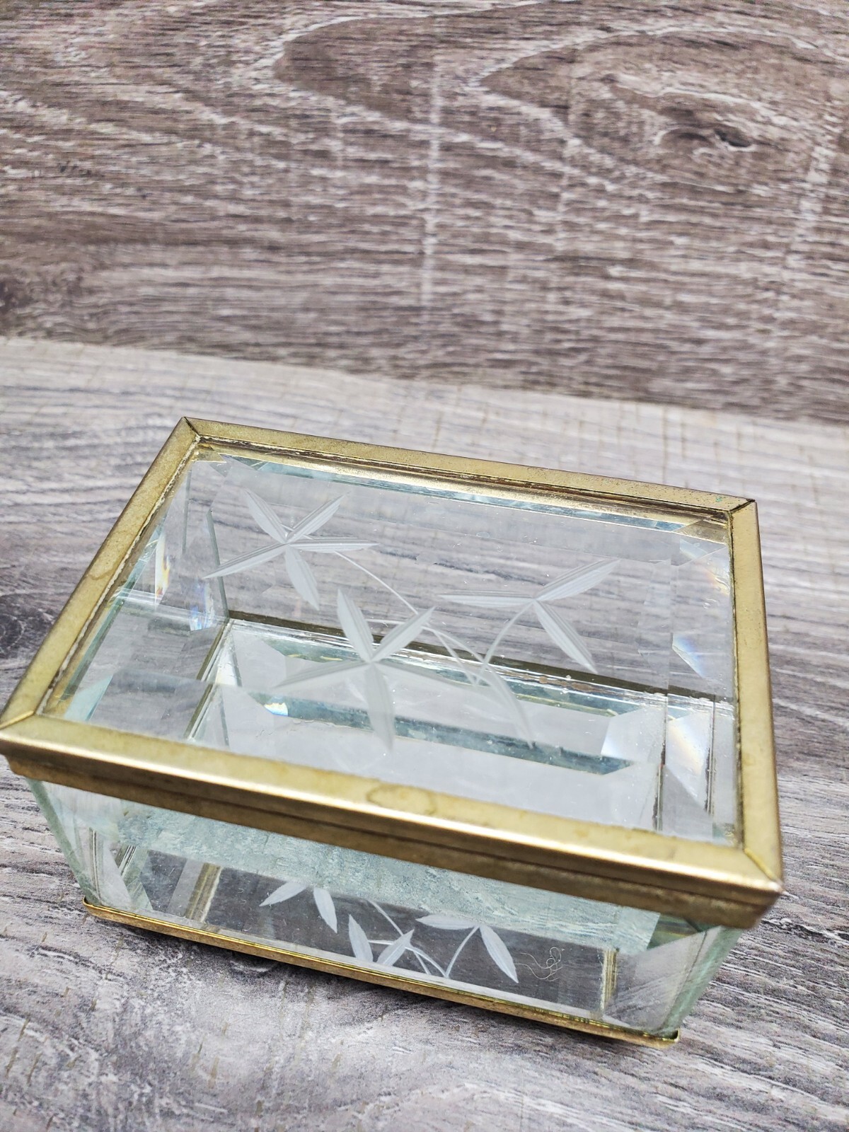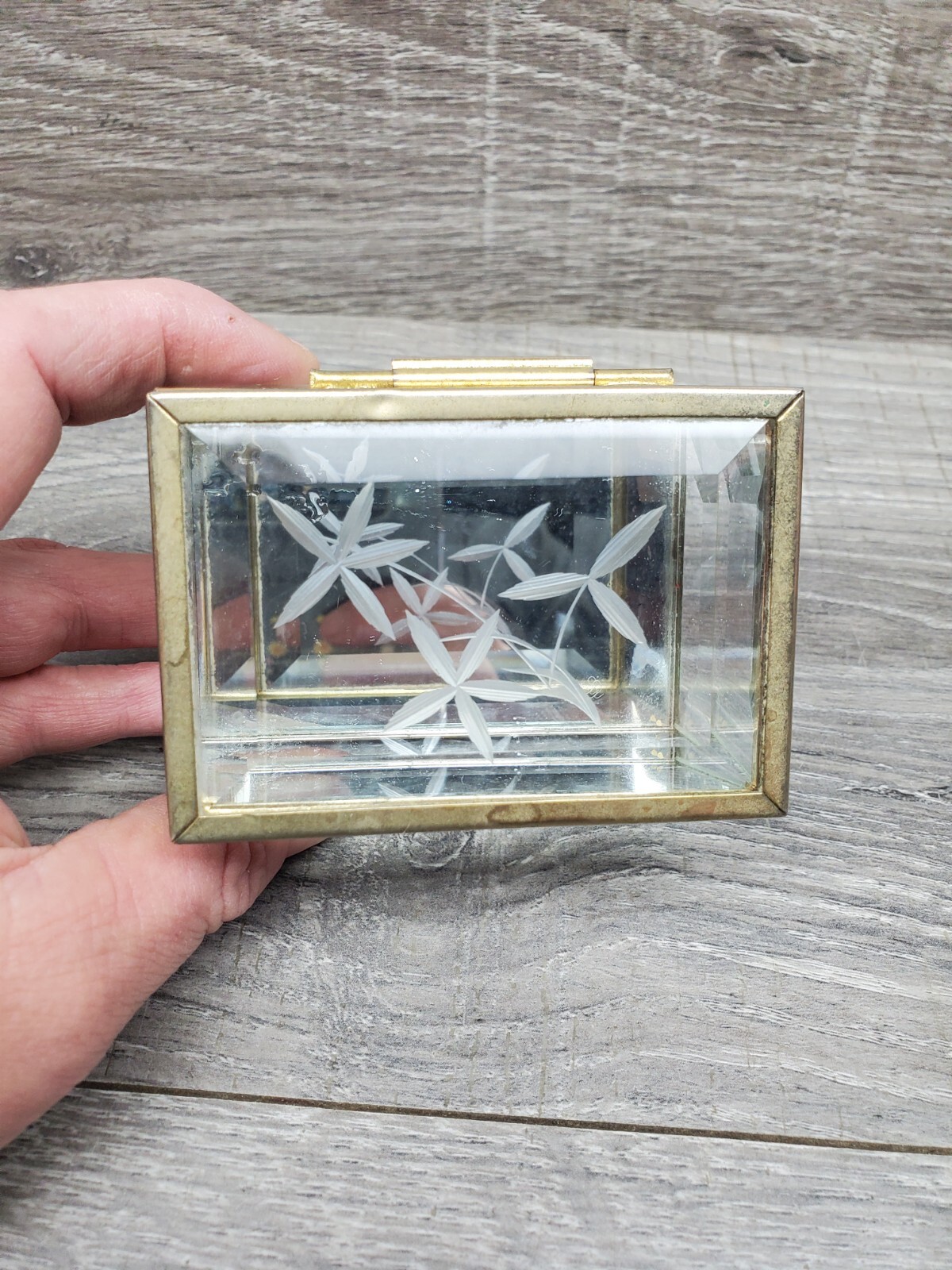 как выглядит Vtg Etched Glass Brass Trinket Box Footed Mirror Bottom Hinged Lid Jewerly Box фото