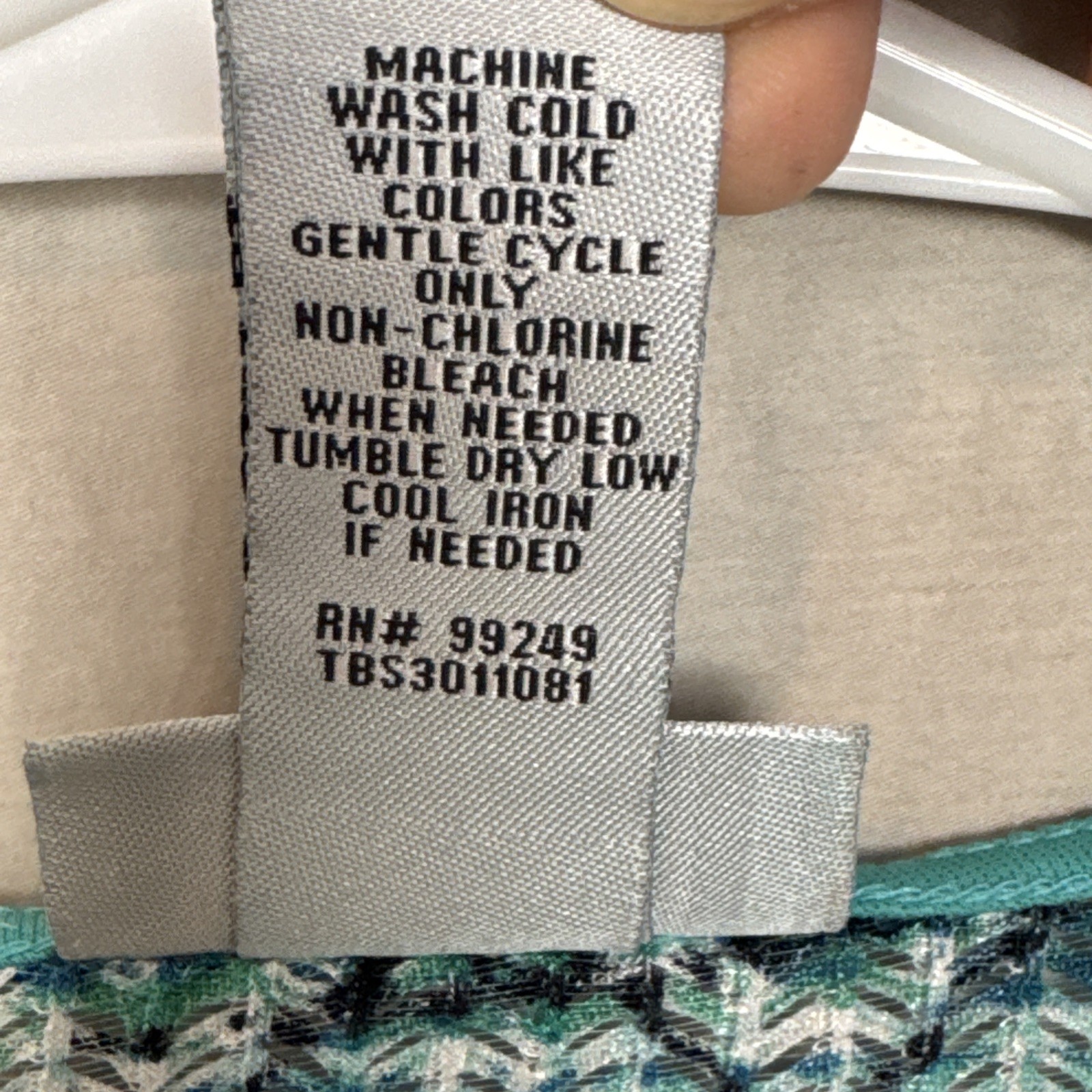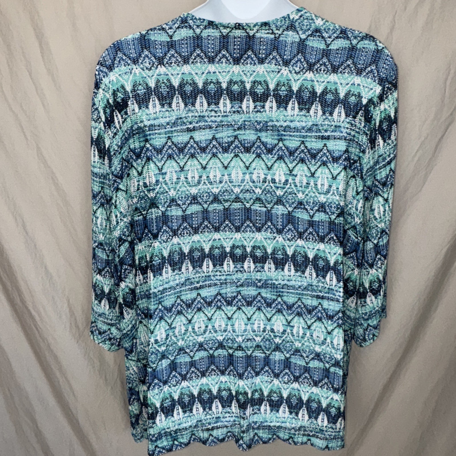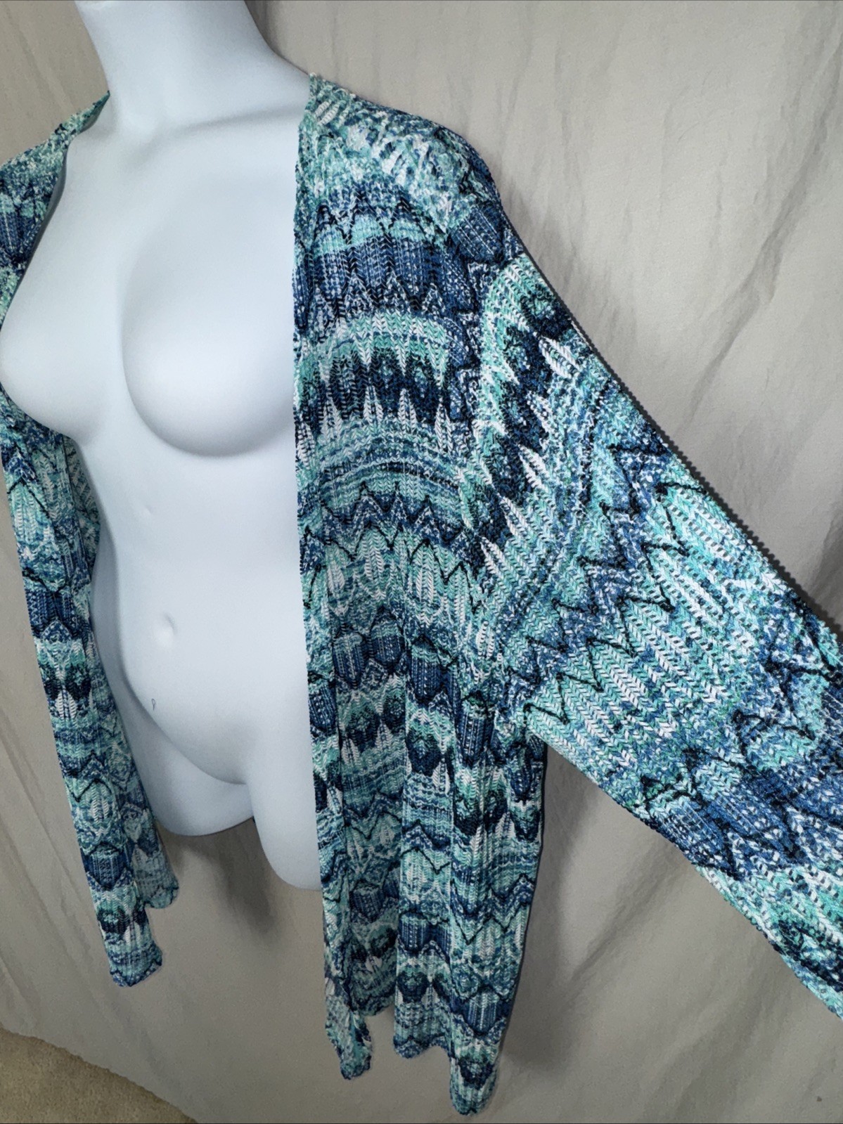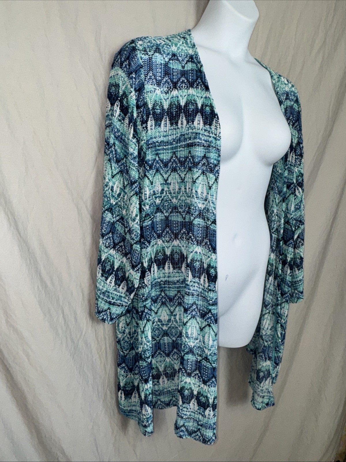 Catherines 4X Open Knit Stretch Kimono Cardigan Womens Blue/Green Geometric Plus
