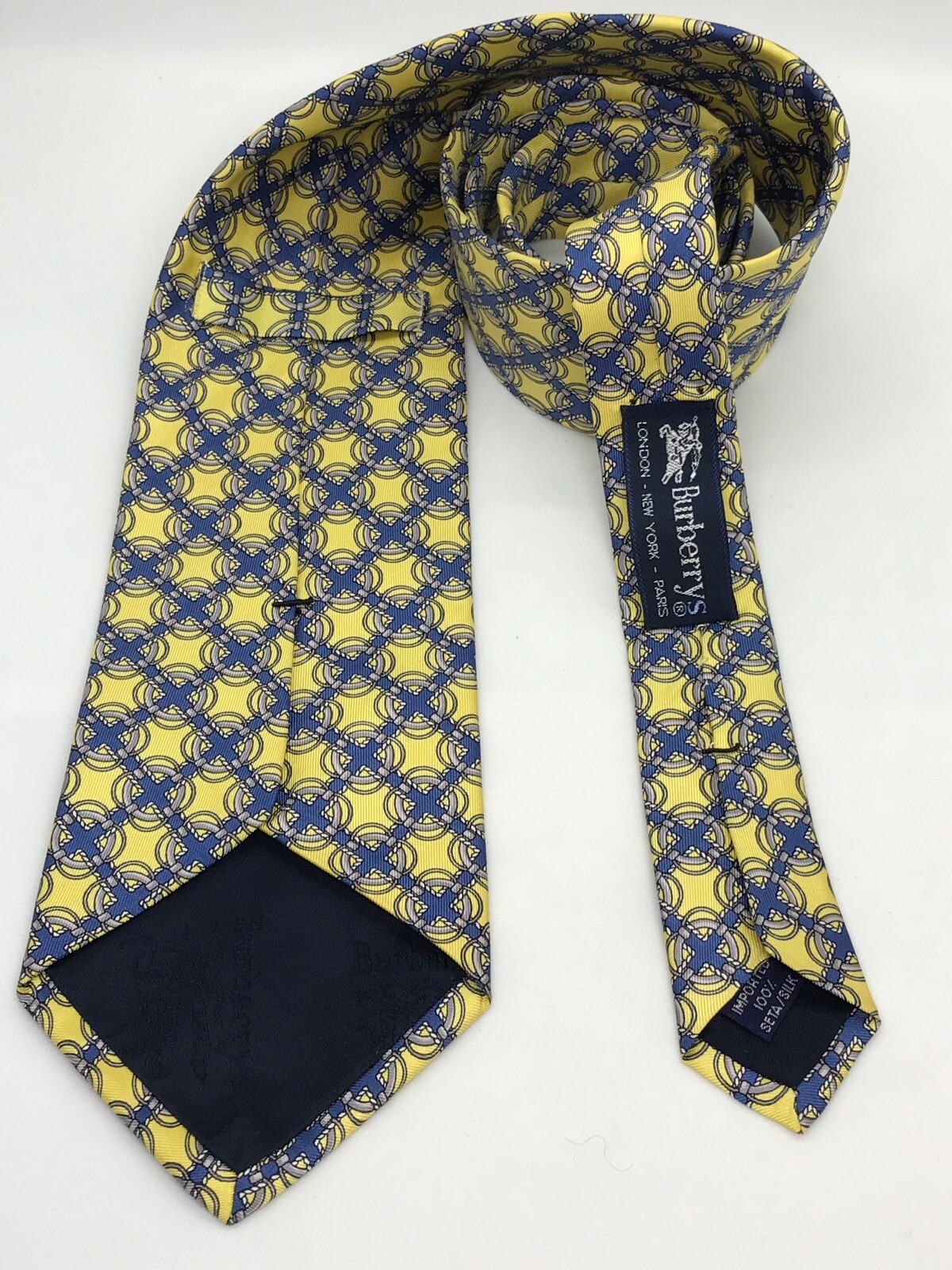 Vintage Authentic Burberry Yellow w Blue Gray Print 100 Silk Men's Tie USA